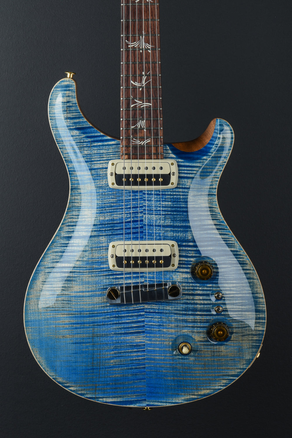 Faded Blue Jean, High gloss nitro finish, Violin carved Flame Maple 10 top, Mahogany body, Pattern carved Mahogany neck, 10" radius Honduran Rosewood fingerboard with the Brushstroke Bird inlays, 25" scale length, 1 11/16th" nut width, TCI bridge and neck pickups, 3-way toggle switching with the volume and tone controls plus the two mini-toggle coil tap switches, PRS stoptail bridge with the brass inserts, PRS Phase III locking tuners, 7.3 pounds, With hardshell case