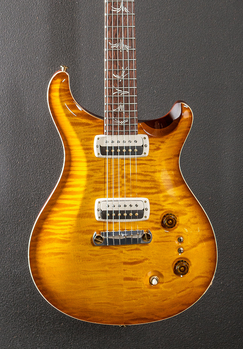 McCarty Sunburst, High gloss nitro finish, Violin carved Flame Maple 10 top, Mahogany body, Pattern carved Mahogany neck, 10" radius Honduran Rosewood fingerboard with the Brushstroke Bird inlays, 25" scale length, 1 11/16th" nut width, TCI bridge and neck pickups, 3-way toggle switching with the volume and tone controls plus the two mini-toggle coil tap switches, PRS stoptail bridge with the brass inserts, PRS Phase III locking tuners, 7.8 pounds, With hardshell case