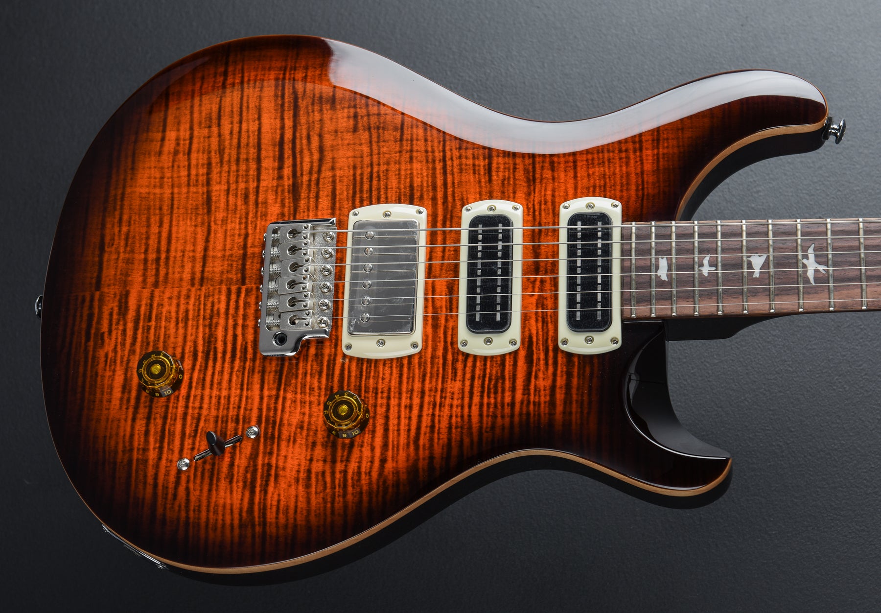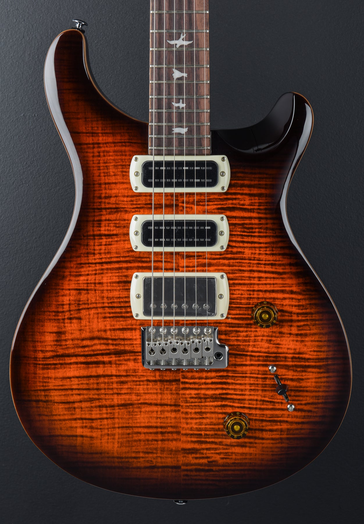 Excellent Condition, Orange Tiger Smokeburst, Mahogany Body, Shallow Violin Carved Maple Top with a Figured Maple Veneer, 10" Radius Rosewood Fingerboard with Bird Inlays on a Wide Thin Carved Maple Neck, 1 11/16" Nut Width, 25" scale length, 58/15 “S” Bridge and Narrowfield DD “S” Neck/Middle Pickups, 5-Way Switching with Volume and Push-Pull Coil Tap Tone Controls, PRS Patented Tremolo and PRS Designed Tuners, 8.4 pounds, Comes with a Gig Bag.