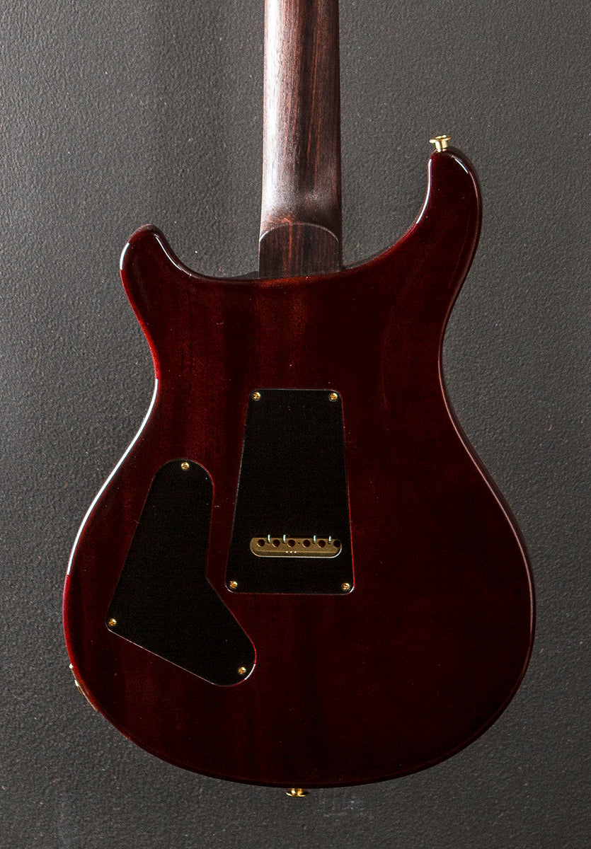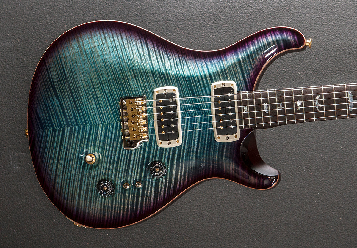 Aquableux Purple Burst, High gloss nitro body finish, Violin carved Flame Maple 10 top, Mahogany body, Pattern Thin carved East Indian Rosewood neck, 10" radius Brazilian Rosewood fingerboard with the Gold Mother of Pearl outlined Mother of Pearl Bird inlays, Brazilian Rosewood headstock veneer, 25" scale length, 1 11/16th" nut width, PRS TCI bridge and neck pickups, 3-way toggle switching with the volume and tone controls plus the two mini-toggle EQ switches, PRS Gen III tremolo, PRS Phase III locking tuners with the wing buttons, 7.8 pounds, With hardshell case