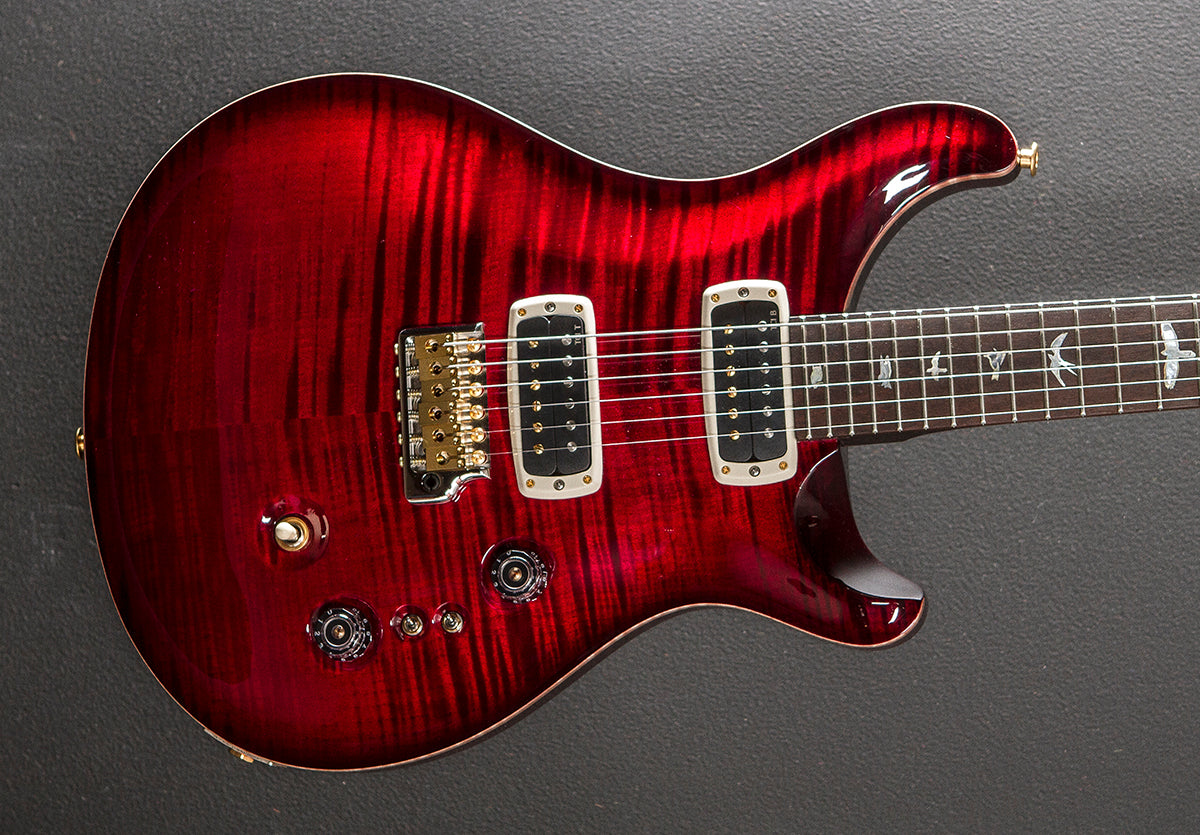 Fire Red Burst, High gloss nitro body finish, Violin carved Flame Maple 10 top, Mahogany body, Pattern Thin carved East Indian Rosewood neck, 10" radius Brazilian Rosewood fingerboard with the Gold Mother of Pearl outlined Mother of Pearl Bird inlays, Brazilian Rosewood headstock veneer, 25" scale length, 1 11/16th" nut width, PRS TCI bridge and neck pickups, 3-way toggle switching with the volume and tone controls plus the two mini-toggle EQ switches, PRS Gen III tremolo, PRS Phase III locking tuners with the wing buttons, 7.8 pounds, With hardshell case