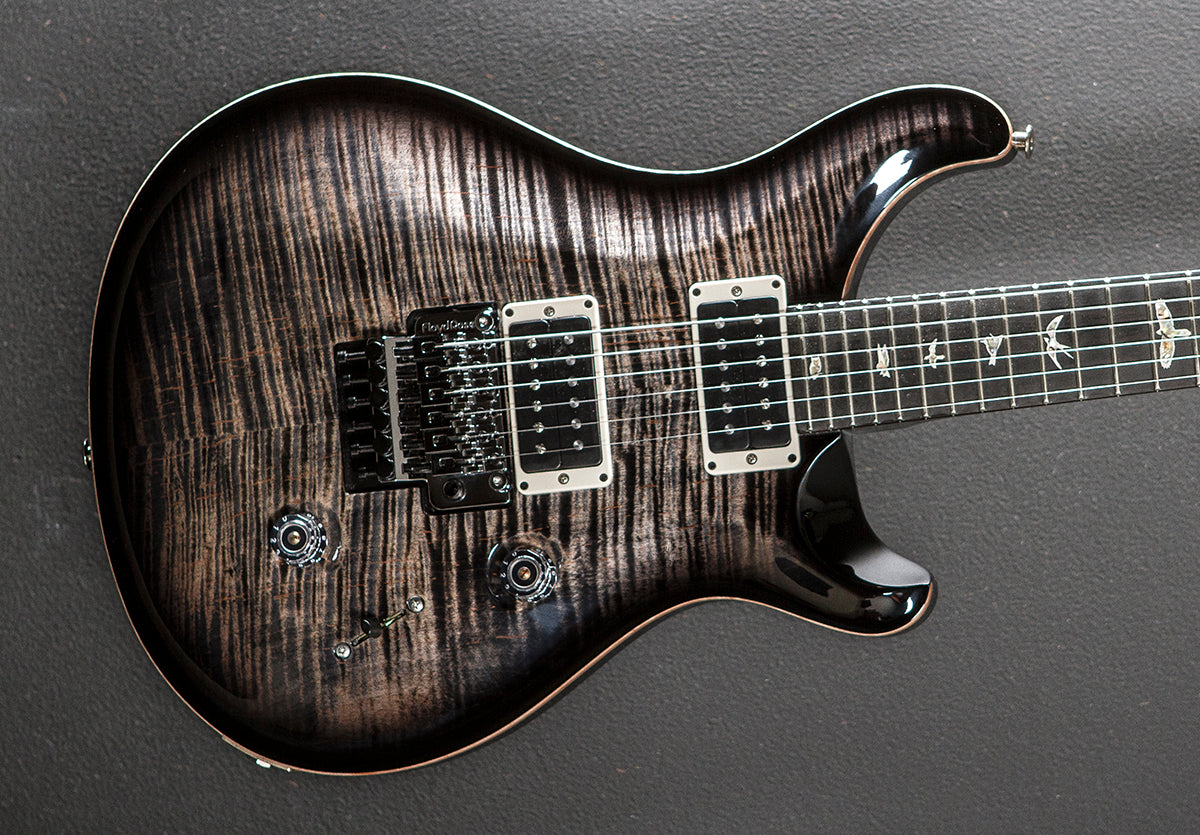 "The Custom 24 "Floyd" is equipped with the time-tested Floyd Rose "Original" tremolo system and PRS's \ m / (metal) pickups. The Floyd Rose "Original" tremolo and locking nut tuning system is a double-locking design precision-made from high quality steel. This design combination allows players to lock the string at the nut and at the bridge to keep the guitar in tune even during the heaviest dive-bombing sessions.