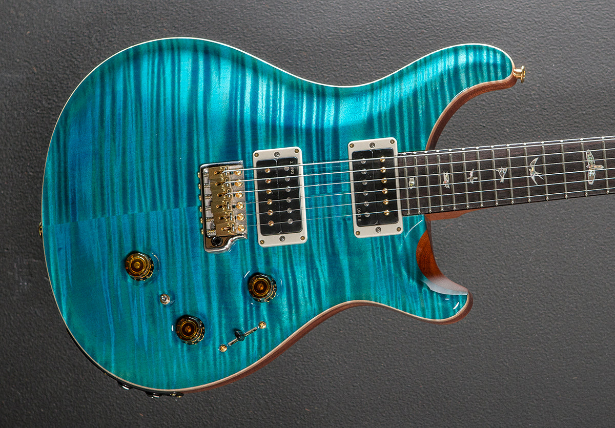 "The Custom 24 Piezo is a 24-fret solidbody piezo-equipped guitar that effortlessly achieves classic humbucker tones and authentic acoustic sounds in one instrument. With classic PRS appointments, including a figured maple top, mahogany back, 24-fret, 25” scale length mahogany neck with rosewood fretboard, PRS’s patented Gen III tremolo, and Phase III tuners with wing buttons, the Custom 24 Piezo is a unique tool for musicians in the writing room, the studio, and on the stage.