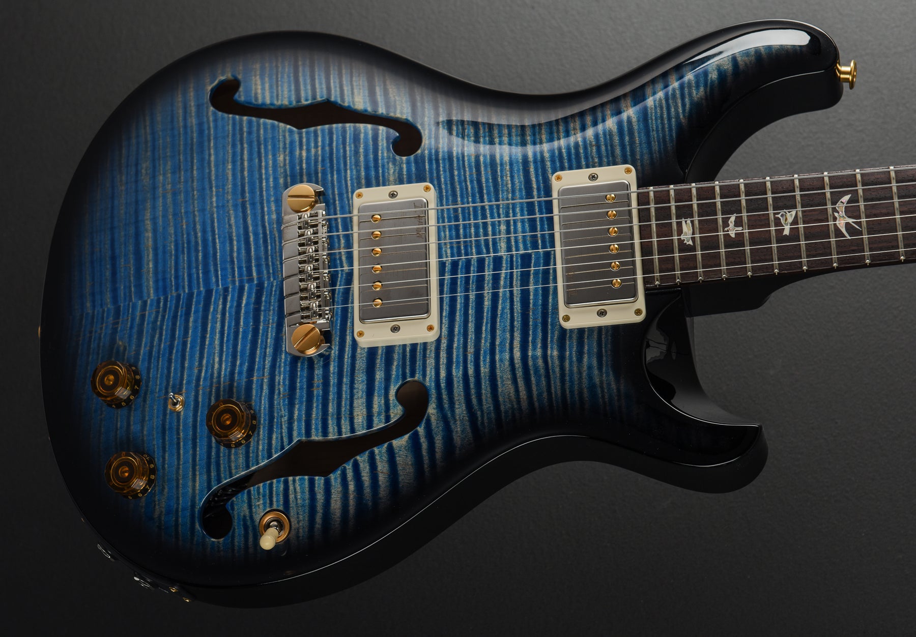 Blue Jean Wraparound Burst, High Gloss Nitro Finish, Violin Carved Flame Maple 10 Top and Back, Mahogany Body Core, Pattern Carved Mahogany Neck, 10" Radius Rosewood Fingerboard with the Bird Inlays, 25" Scale Length, 1 11/16th" Nut Width, PRS 58/15 LT Bridge and Neck Pickups with the L.R. Baggs/PRS Adjustable Piezo Stoptail Bridge, 3-Way Toggle Switching with the Volume and Tone Controls Plus the Piezo Pickup System 3-Way Selector and Blend Knob, PRS Phase III Non-Locking Tuners with the Wing Buttons, 5.5 Pounds, with Hardshell Case.