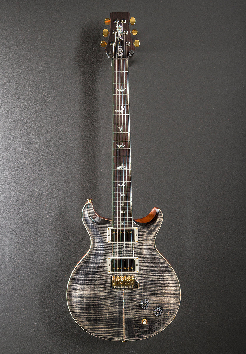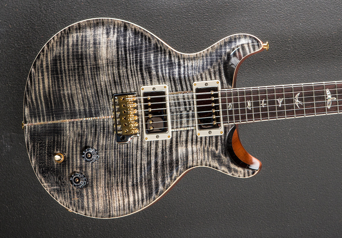 Charcoal, High gloss nitro finish, Violin carved Flame Maple 10 top, Mahogany body, Santana Retro carved Mahogany neck, Bound 10″ radius Rosewood fingerboard with the Bird inlays, 24.594 ″ scale length, 1 11/16th” nut width, Santana bridge and neck pickups, 3-way toggle switching with the master volume and tone controls, PRS patented Gen III tremolo and PRS Phase III locking tuners, 8.0 pounds, With hardshell case
