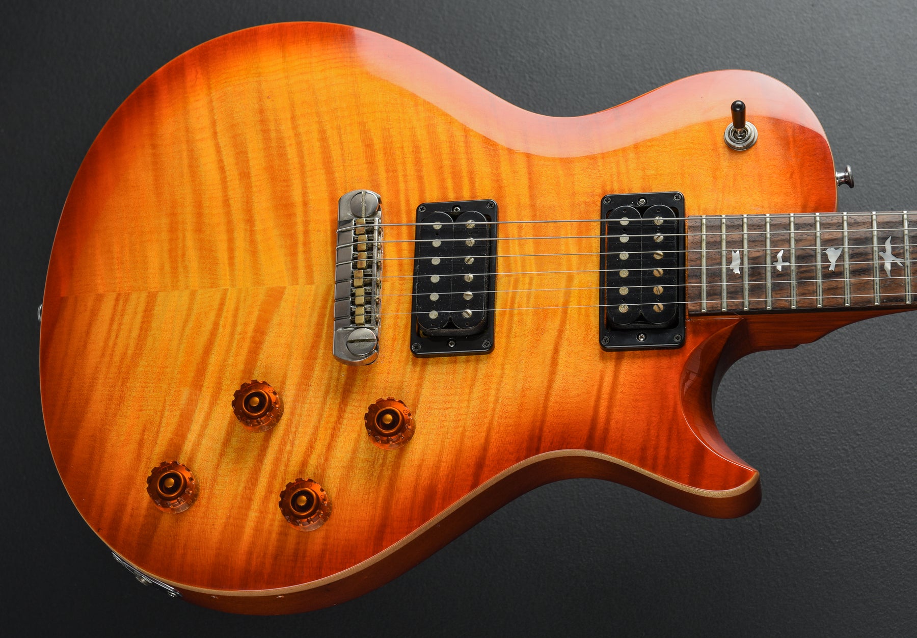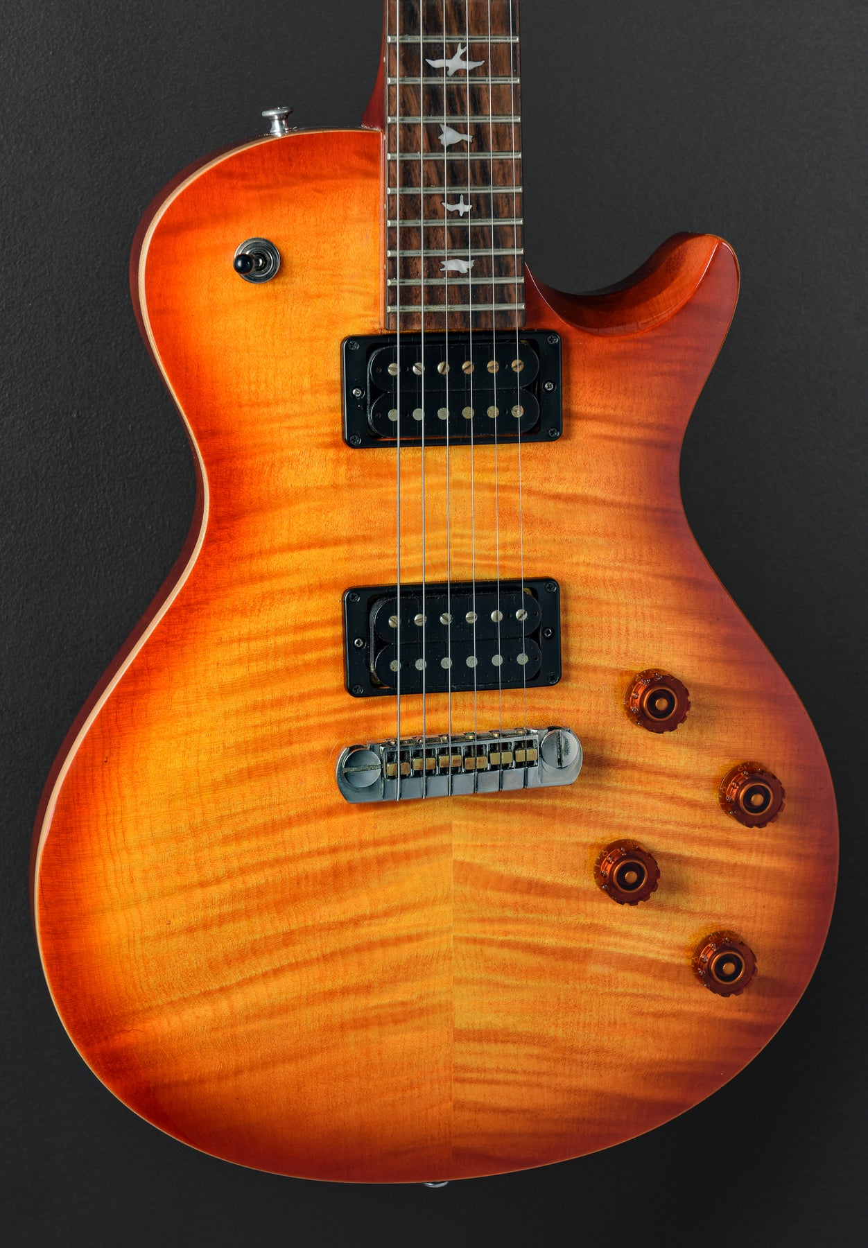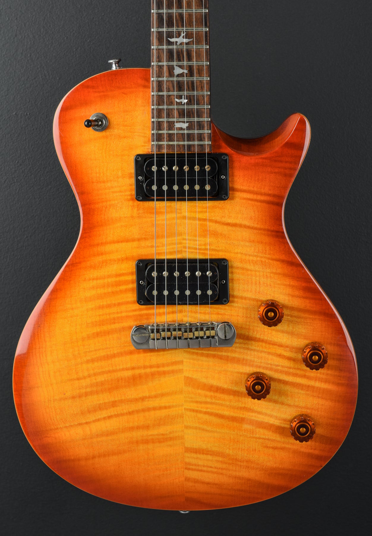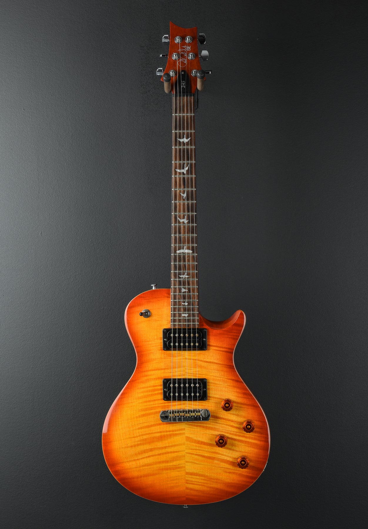 Very Good Condition, Vintage Sunburst Finish, Beveled Maple Top with a Flame Maple Veneer on a Mahogany Body, Wide/Fat Carved Mahogany Neck, 10" Radius Rosewood Fingerboard with Bird Inlays, 24.5" Scale Length, 1 11/16th" Nut Width, PRS 245 “S” Bridge and Neck Pickups, 3-Way Toggle Switching with Volume and Tone Controls for Each Pickup, PRS Adjustable Stoptail Bridge, PRS Designed Tuners, 7.9 Pounds, Comes with a Gig Bag.