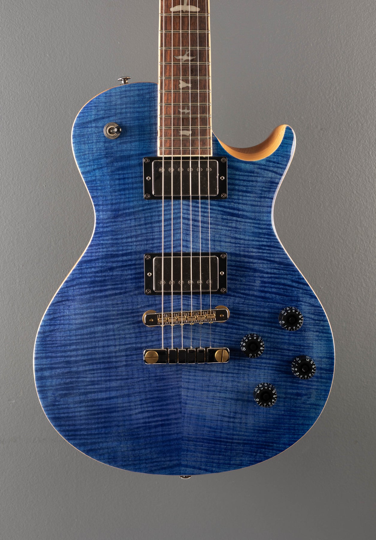 Very Good Condition, Faded Blue, Shallow violin carved Maple top with a Flame Maple veneer, Pattern Vintage carved Mahogany neck, Bound 10" radius Rosewood fingerboard with the Bird inlays, 24.594” scale length, 1 11/16th" nut width, 58/15 LT "S" bridge and neck pickups, 3-way toggle switching with the volume and push/pull coil tap tone controls for each pickup, PRS two-piece bridge and vintage style tuners, 8.6 pounds, With gig bag.