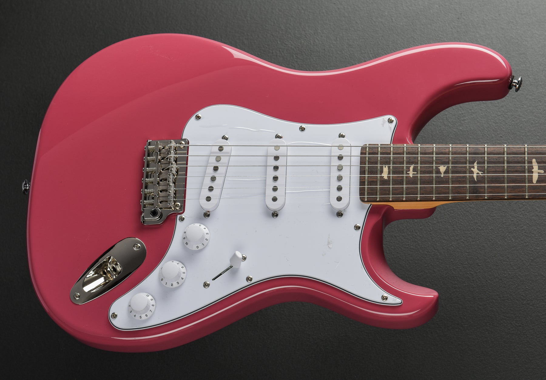 Very Good Condition, Dragon Fruit, Poplar Body, 635JM Shaped Maple Neck with an 8.5” Radius Rosewood Fingerboard and Small Bird Inlays, 25.5" Scale Length, 1 20/32nd" Nut Width, PRS 635JM Single Coil Pickups, 5-Way Switching with Master Volume and Two Tone Controls, Two Point Steel Tremolo with Bent Steel Saddles, Vintage Style Tuners, 6.7 Pounds, Comes with a Gig Bag.