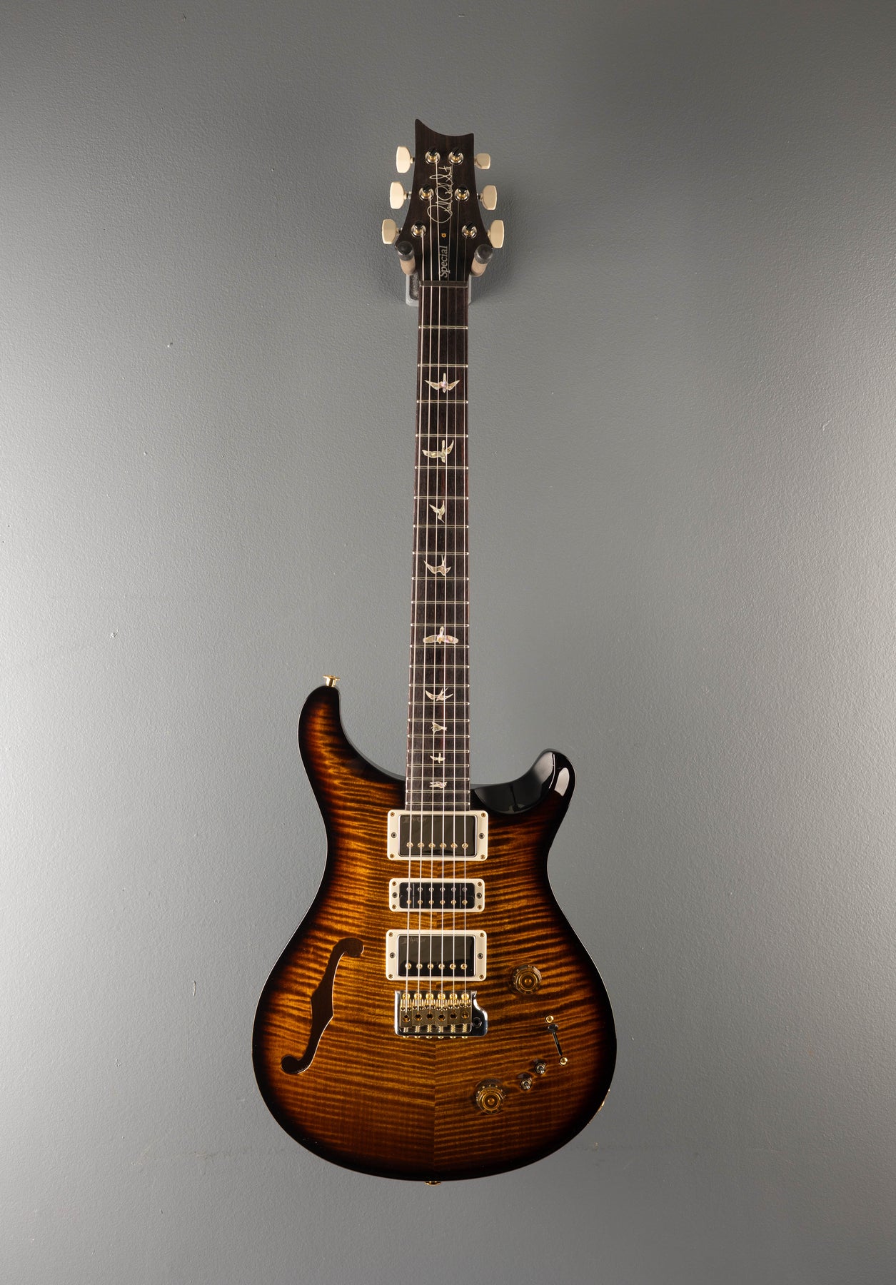 Black Gold Wraparound Burst, High gloss nitro finish, Violin carved Flame Maple 10 top with the single F hole, Semi-hollow Mahogany body, Pattern carved Mahogany neck, 10″ radius Rosewood fingerboard with the Bird inlays, 25″ scale length, 1 11/16th” nut width, PRS 58/15 LT bridge and neck pickups with a PRS Narrowfield middle pickup, 5-way blade switching with the volume and tone controls plus the two mini-toggle coil tap switches, PRS Gen III tremolo, PRS Phase III locking tuners with the wing buttons, 6.8 pounds, With hardshell case