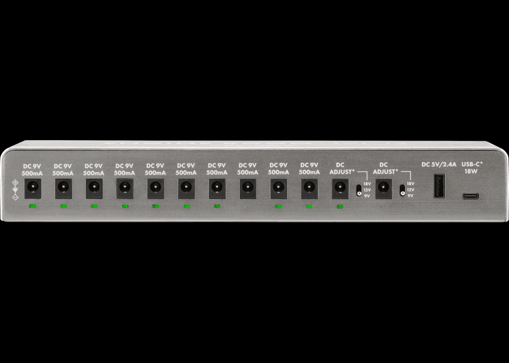 Designed to accommodate all your pedalboard needs, the Engine Room® LVL 12 is ready to deliver. Featuring twelve ground isolated power outlets, (10) are capable of delivering 9Vdc at 500mA while (2) additional outlets provide switchable voltage (9v/12v/18v) via 3-way toggle or slide switch. A courtesy IEC outlet on the back allows you to add an additional Engine Room® LVL5, LVL8, or even LVL12 for the biggest rigs.