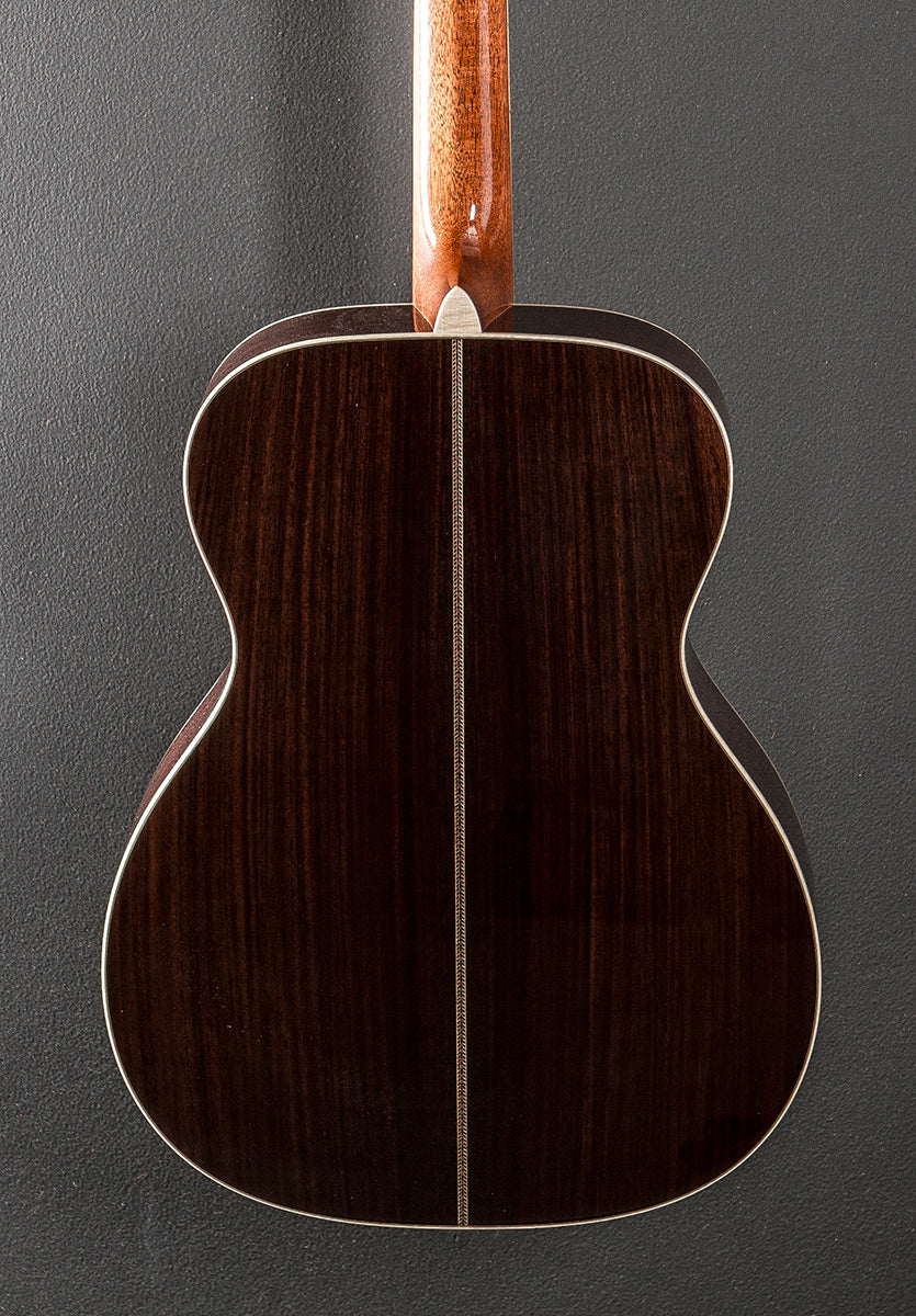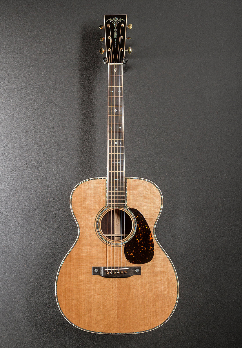 Natural, Gloss finish, 000-14 Fret body shape, Solid Sitka Spruce top w/VTS, Adirondack Spruce w/VTS scalloped X bracing, Abalone with multi-stripe Rosette, European Flame Maple binding, Abalone w/multi-stripe top inlay and multi-stripe back inlay, East Indian Rosewood back and sides, Style 45 Golden Era back purfling, Ebony fingerboard with the Abalone Golden Era 45 Style Snowflake inlays on a vintage deluxe w/high performance taper shaped Mahogany neck, 24.9″ scale length, 1 3/4” nut width, Waverly tuners, With hardshell case