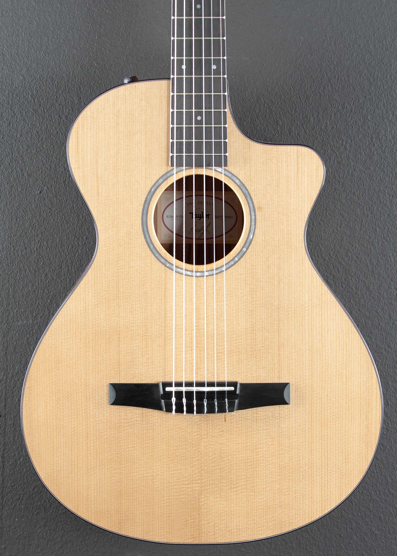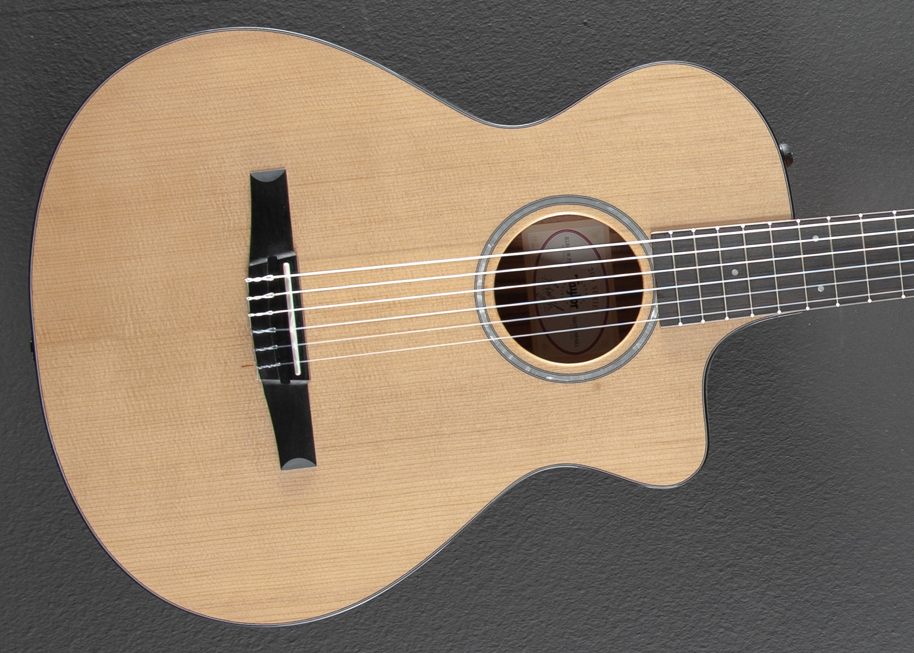 Natural, Gloss top and body finish, Grand Concert body shape with the venetian cutaway, Torrefied Spruce top, Single Ring Faux Pearl Rosette, Nylon series bracing, Layered Indian Rosewood back and sides, Black binding, West African Crelicam Ebony fingerboard with the faux pearl 4mm dot inlays on a Neo-Tropical Mahogany neck, 25.5" scale length, 1 7/8th" nut width, Strip tuners, The neck thickness is .83″ at the first and .85″ at the 9th frets, With the ES-N pickup system and Aerocase hard bag, Excellent