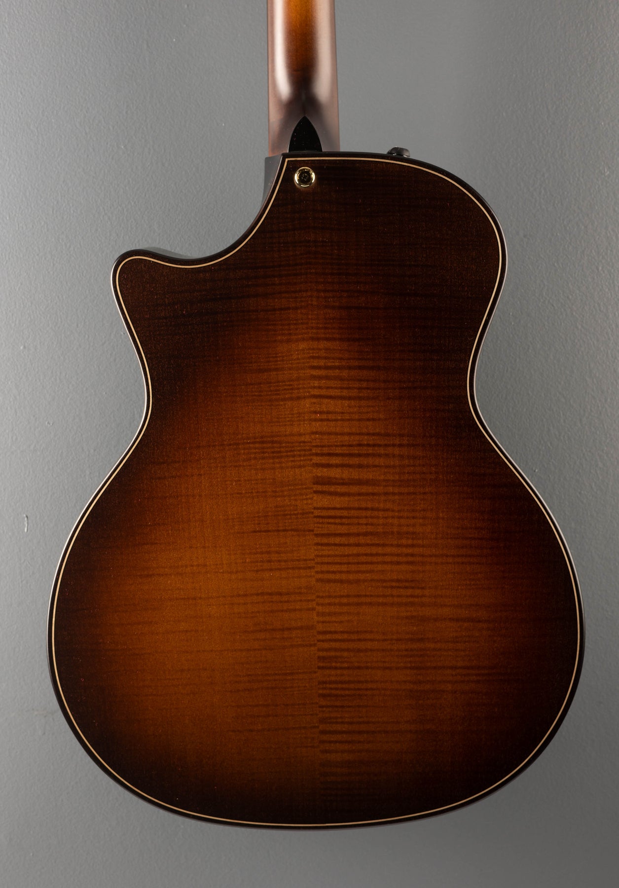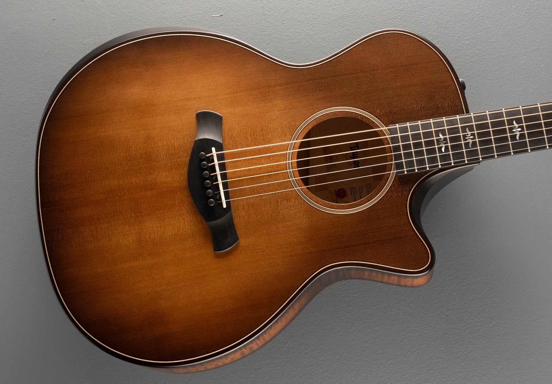 Silent Satin Wild Honey Burst top with the Wild Honey Burst back and sides, Grand Auditorium body shape with the beveled armrest and cutaway, Torrefied Sitka Spruce top, Single Ring Wood/Fiber Rosette, V-Class bracing with Relief Rout, Figured Big Leaf Maple back and sides, Inset Maple/Black top and back edge trim, West African Crelicam Ebony fingerboard with the Mother of Pearl Scepter inlay on a Hard Rock Maple neck, 25.5” scale length, 1 3/4” nut width, With the Expression 2 system and hardshell case