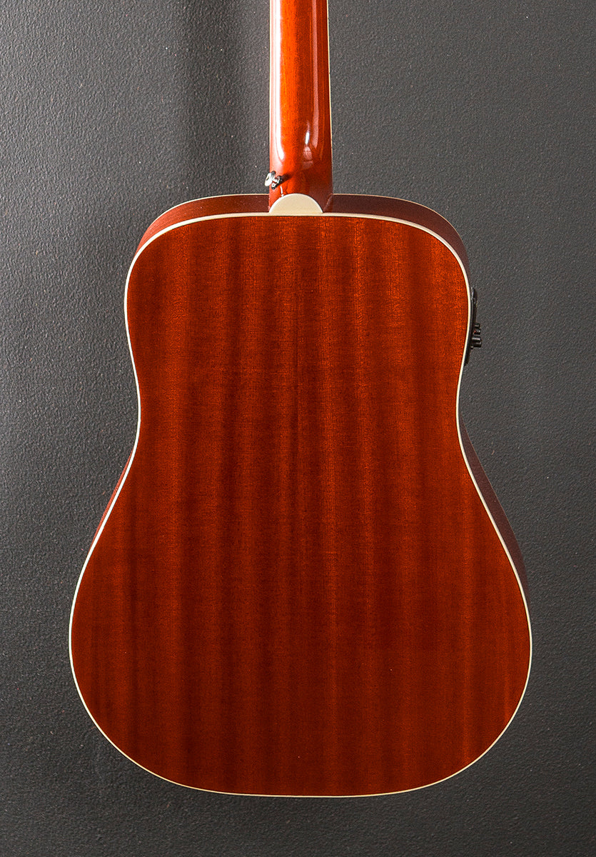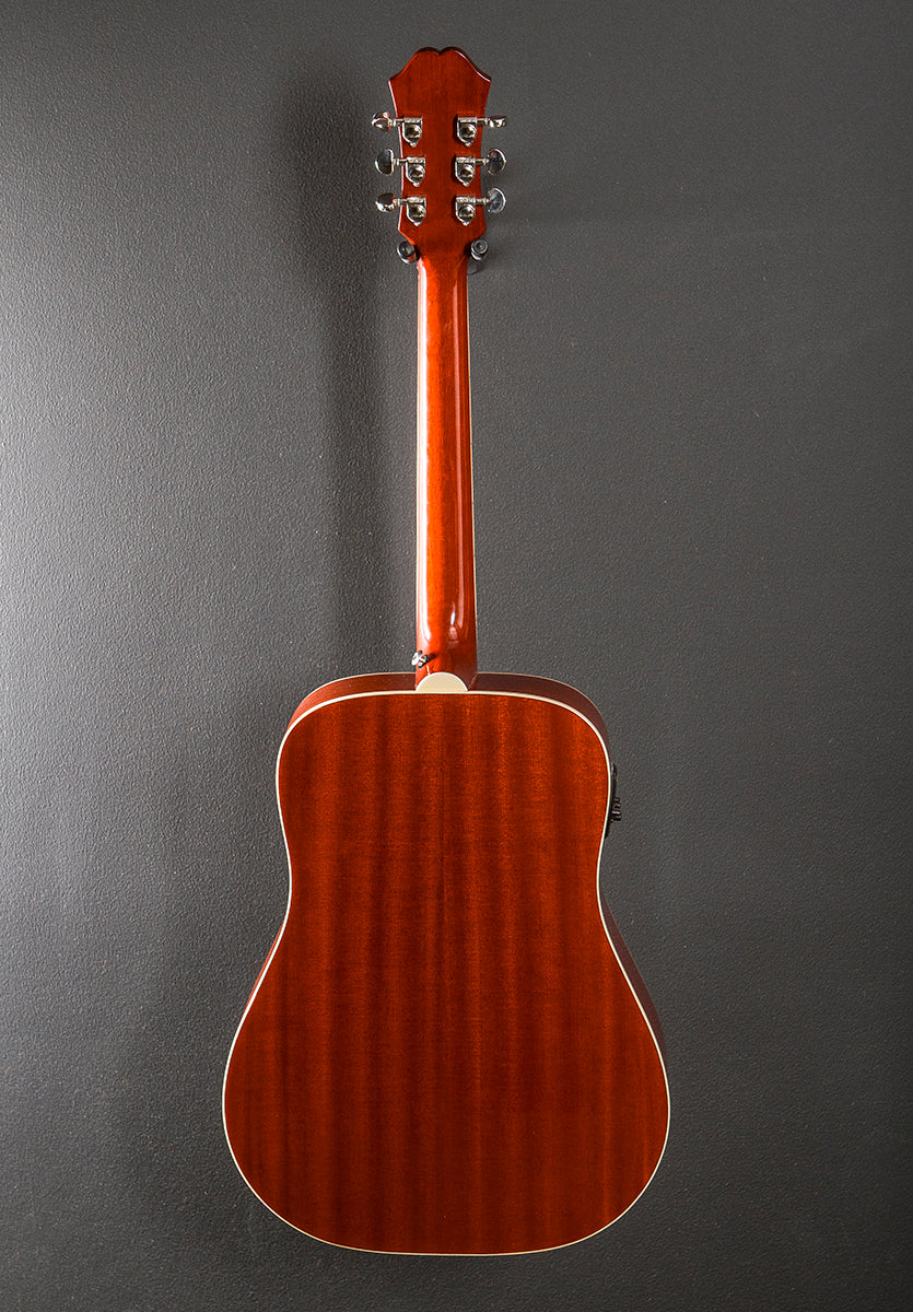 Cherry Sunburst, Gloss finish, Square shoulder Hummingbird body shape, Spruce top, Three Ring Rosette, X bracing, Mahogany back and sides, Slim taper D shaped Mahogany neck, Bound 12" radius Rosewood fingerboard with the split parallelogram inlays and medium jumbo frets, 24.75" scale length, 1 11/16th" nut width, Grover tuners, The neck thickness is .83″ at the first and .89″ at the 9th frets, With the Shadow/E-performer pickup system and hardshell case, Very good