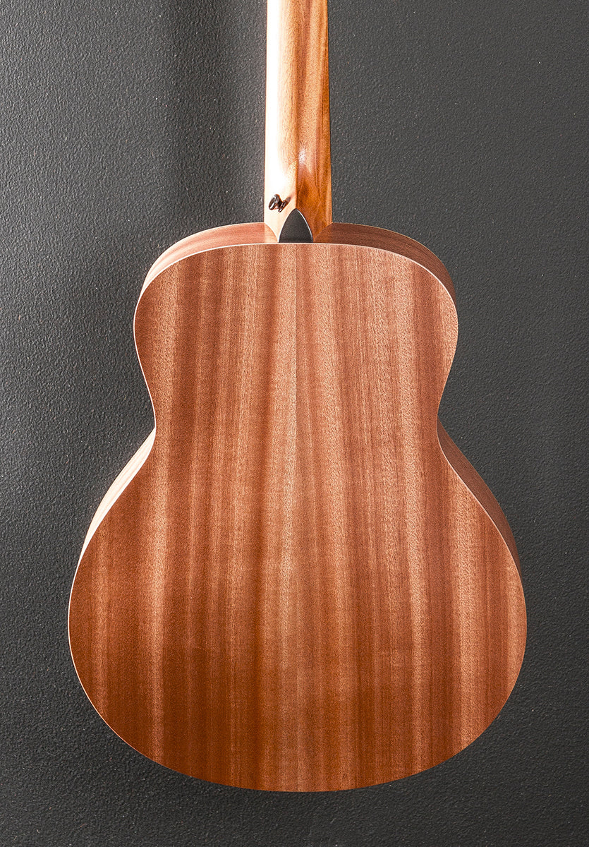 Natural, Tuned to D/A/E/A/D, Matte finish, Miniature Grand Symphony body shape, Sitka Spruce top, Custom multi-color Rosette, X bracing, Sapele back and sides, West African Crelicam Ebony fingerboard with the faux Pearl 4mm dot inlays on a Neo-tropical Mahogany neck, 23.5" scale length, 1 11/16th" nut width, Cast/sealed tuners, The neck thickness is .83″ at the first and .88″ at the 9th frets, With the L.R. Baggs Element VTC pickup system and gig bag, Excellent