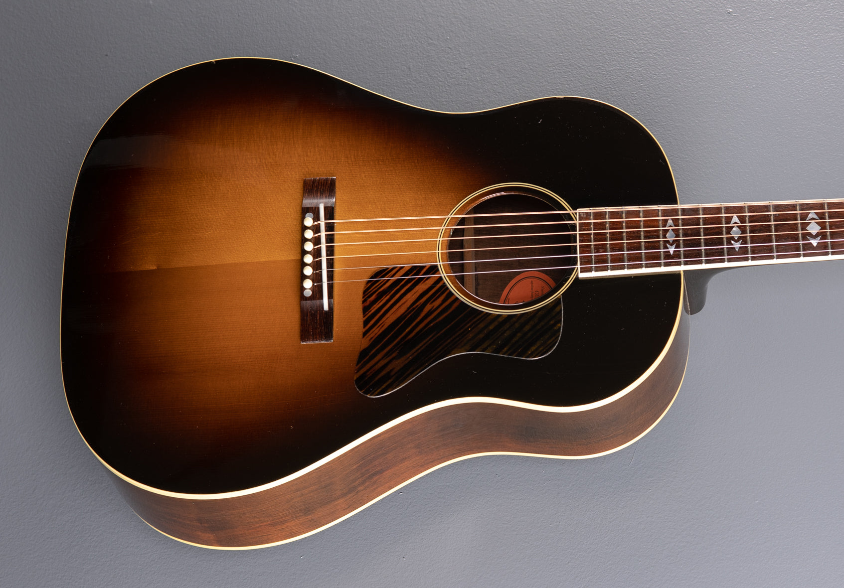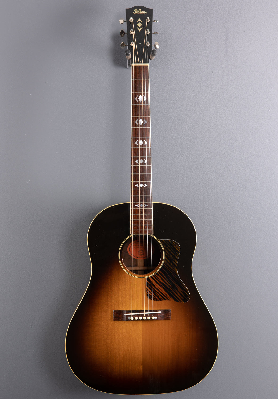 Very Good Condition, Vintage Sunburst, Gloss nitrocellulose lacquer finish, Round Shoulder Advanced Jumbo body shape, Solid Spruce Top with Brazilian Rosewood back and sides, Bound 10" radius Brazilian Rosewood fingerboard on a Mahogany neck, 25.5" scale length, 1.79" nut width, the neck measures .86" at the 1st and .92" at the 9th frets, Waverly Tuners, comes with hardshell case.