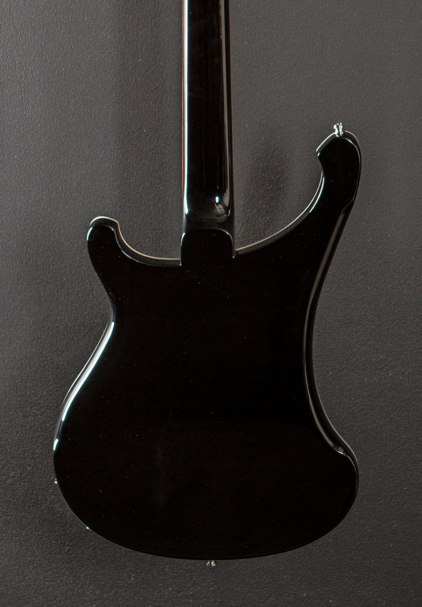 Jetglo, Maple body wings, Thru body Maple/Walnut neck with a bound 10" radius Rosewood fingerboard and the triangle inlays, 33 1/4″ scale length, 1 11/16th" nut width, Rickenbacker single coil bridge and neck pickups, 3-way toggle switching with the volume and tone controls for each pickup plus the push/pull standard or vintage tone selector, Rick-o-Sound and standard mono output jacks, Rickenbacker adjustable bridge and Schaller deluxe open gear tuners, 9.4 pounds, With hardshell case