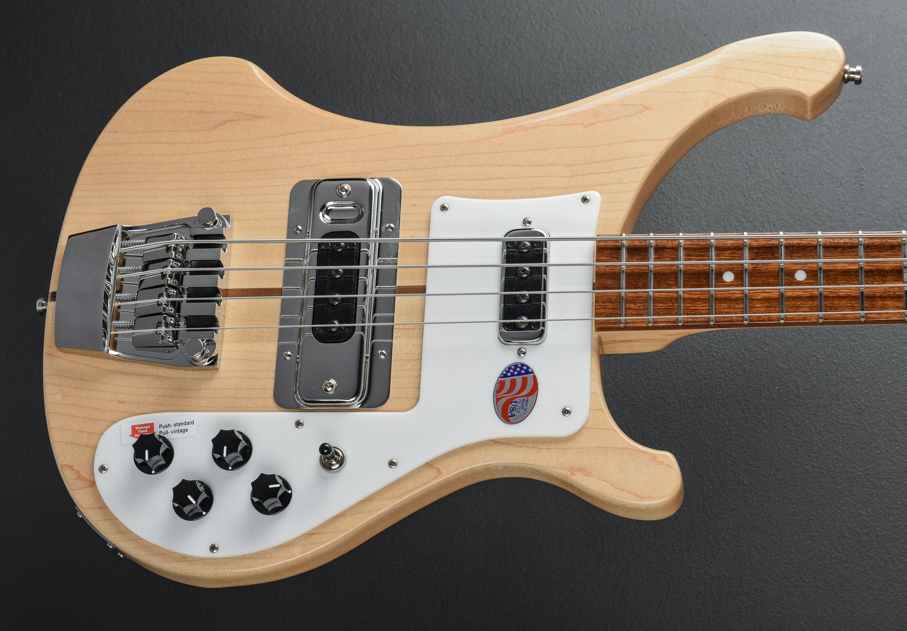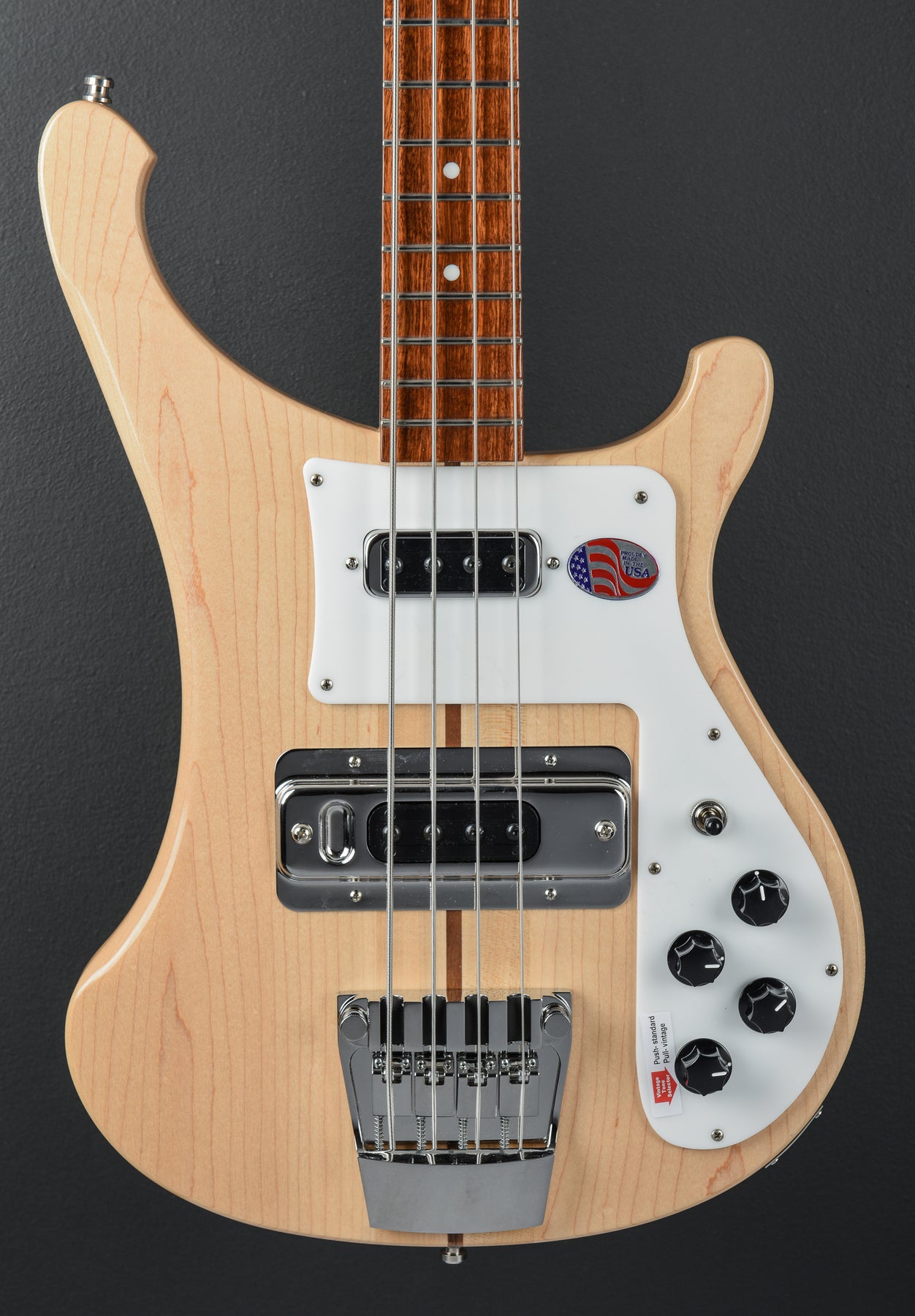 Mapleglo, Maple body wings, Thru body Maple/Walnut neck with 10" radius Rosewood fingerboard and the dot inlays, 33 1/4″ scale length, 1 11/16th" nut width, Rickenbacker single coil bridge and neck pickups, 3-way toggle switching with the volume and tone controls for each pickup plus the push/pull standard or vintage tone selector, Mono output jack, Rickenbacker adjustable bridge and Schaller deluxe open gear tuners, 9.7 pounds, With hardshell case