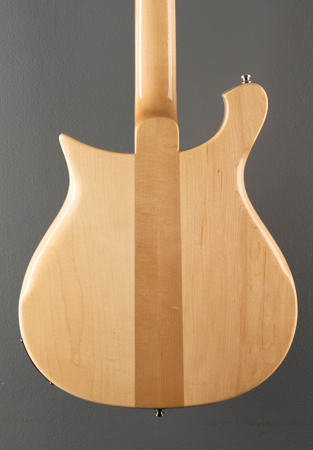 Mapleglo, Maple body wings, Thru body Maple neck, Bound 10" radius Rosewood fingerboard with the triangle inlays, 24.75″ scale length, 1.63″ nut width, Rickenbacker Hi-Gain bridge and neck pickups, 3-way toggle switching with the volume and tone controls for each pickup plus the bass blend control, Ric-o-Sound and standard output jacks, Six saddle adjustable bridge and "R" tailpiece, Gotoh tuners, 7.6 pounds, With hardshell case