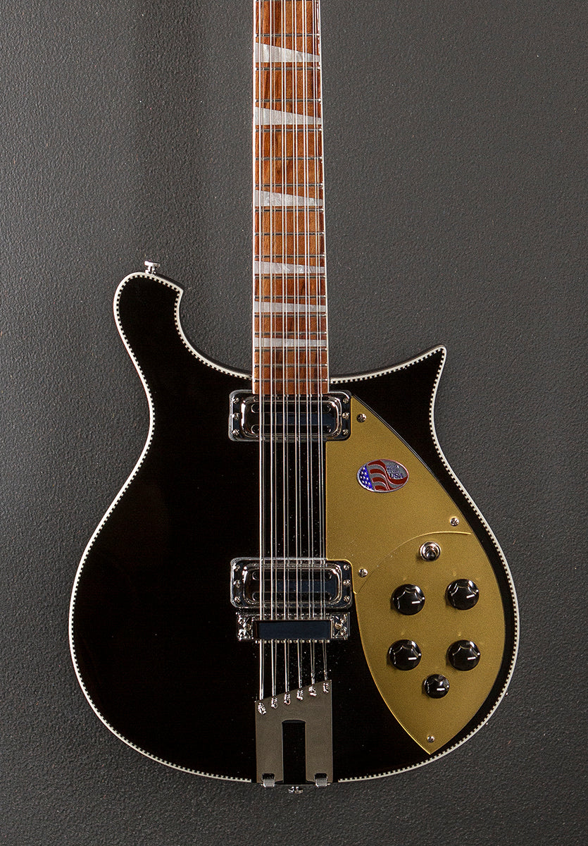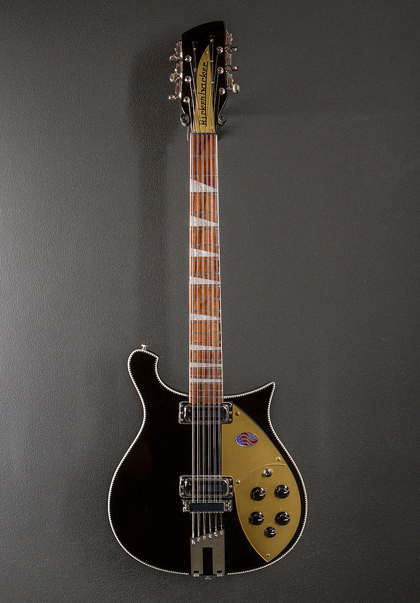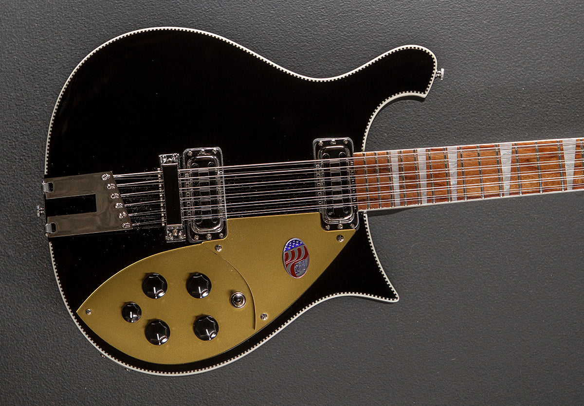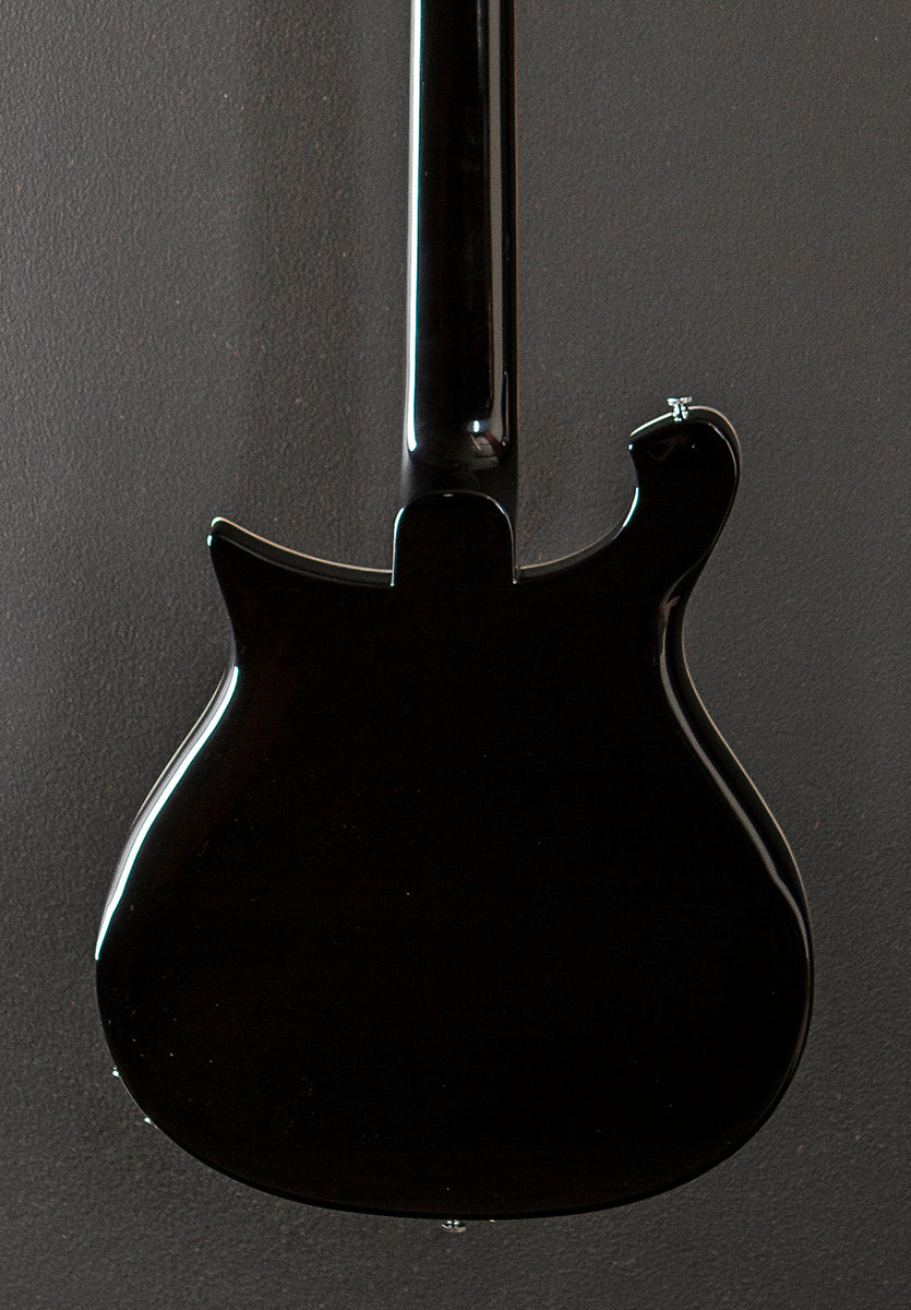 Jetglo, Maple body wings, Thru body Maple neck, Bound 10" radius Rosewood fingerboard with the triangle inlays, 24.75″ scale length, 1.75″ nut width, Rickenbacker vintage single coil Toaster Top bridge and neck pickups, 3-way toggle switching with the volume and tone controls for each pickup plus the bass blend control, Standard mono output jack, Twelve saddle adjustable bridge and trapeze tailpiece, Ric deluxe tuners, 7.2 pounds, With hardshell case