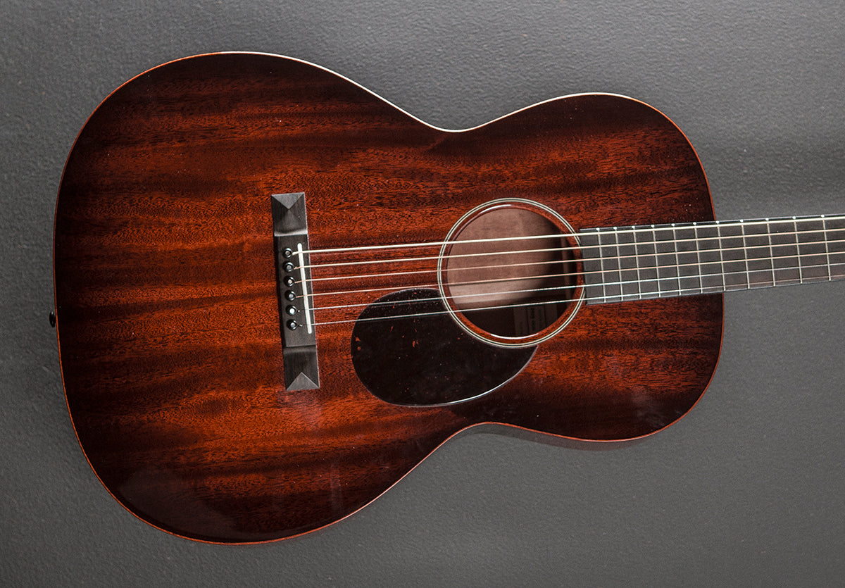 Sunburst, Serial number 6030, Gloss finish, 000 12-Fret body shape, Mahogany top, Ivoroid/Tortoise/Ivoroid Rosette, Scalloped bracing, Mahogany back and sides, Mahogany binding, V shaped Mahogany neck, Bound 14" radius Ebony fingerboard and medium frets, 25.5" scale length, 1 3/4" nut width, Waverly open gear tuners, The neck thickness is .83″ at the first and .96″ at the 9th frets, With hardshell case, Very good