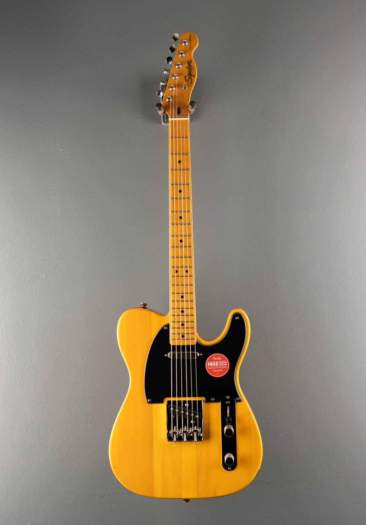 "A celebration of the birth of the Tele® in the early 1950s, the Classic Vibe ‘50s Telecaster creates incredible tone courtesy of the Fender-Designed alnico single-coil pickups. Player-friendly features include a slim, comfortable “C”-shaped neck profile with an easy-playing 9.5”-radius fingerboard and narrow-tall frets, as well as a vintage-style Telecaster bridge with barrel saddles and string-through-body design. This throwback Squier model also features 1950s-inspired headstock markings, rich-looking nickel-plated hardware and a slick vintage-tint gloss neck finish for an old-school vibe."