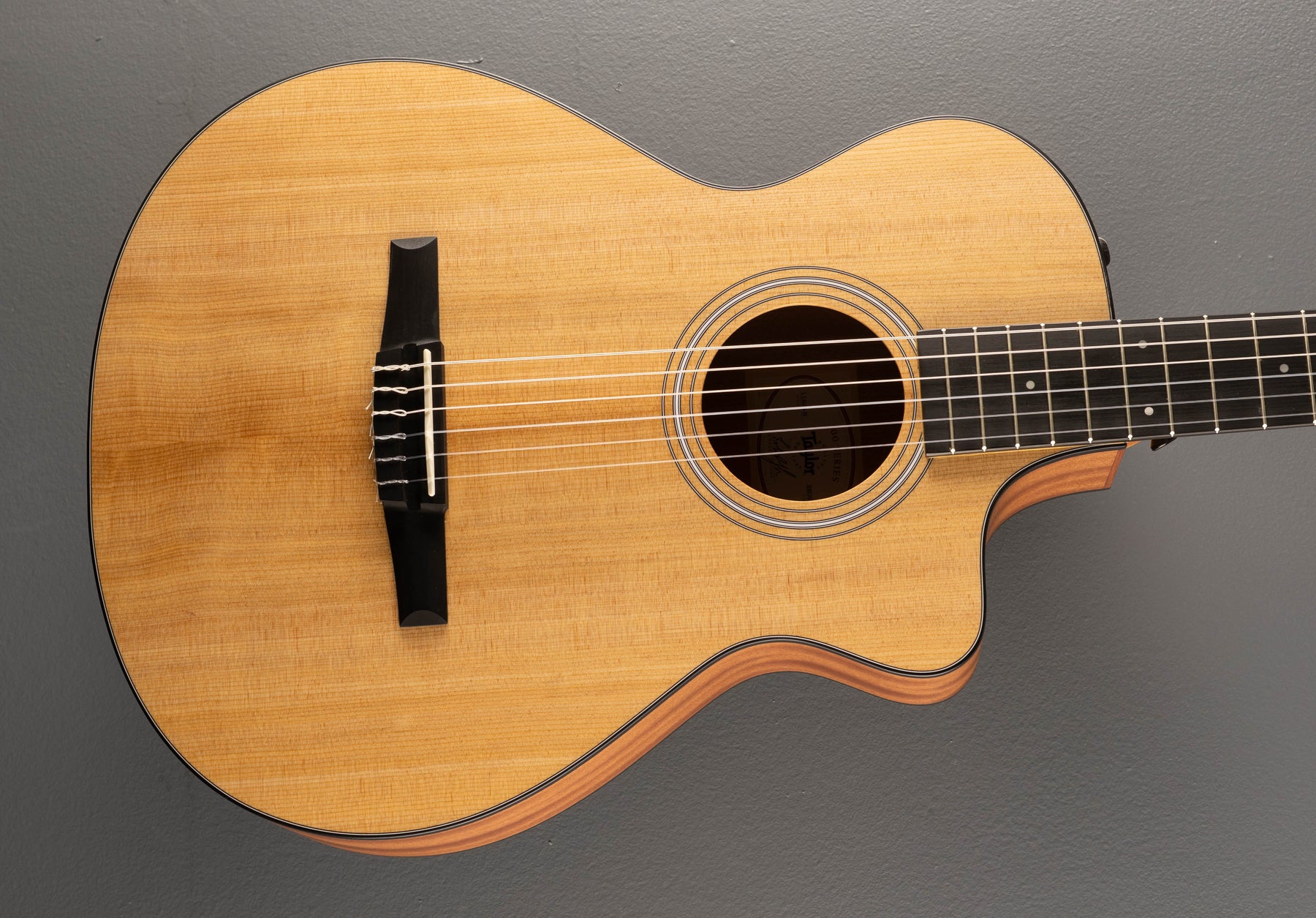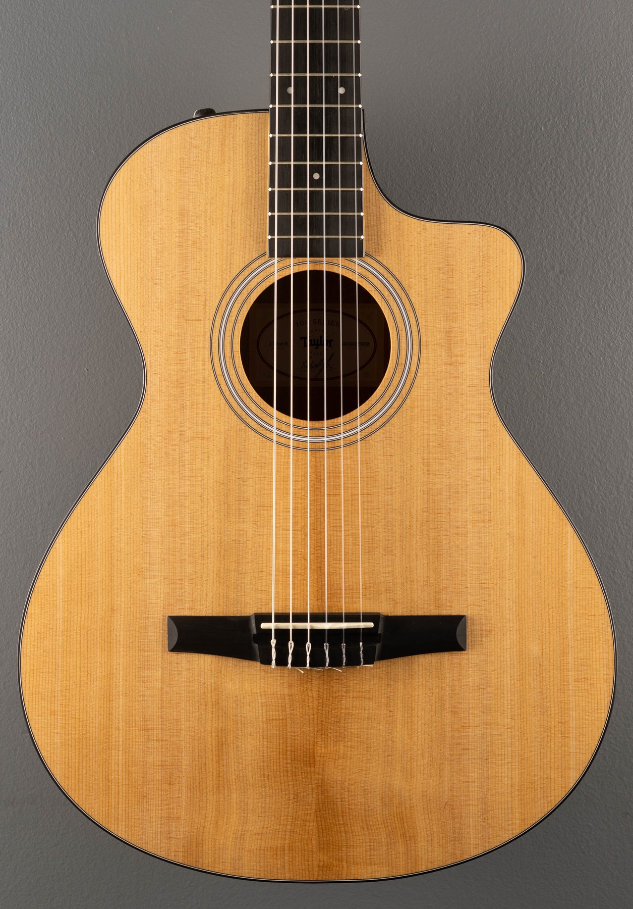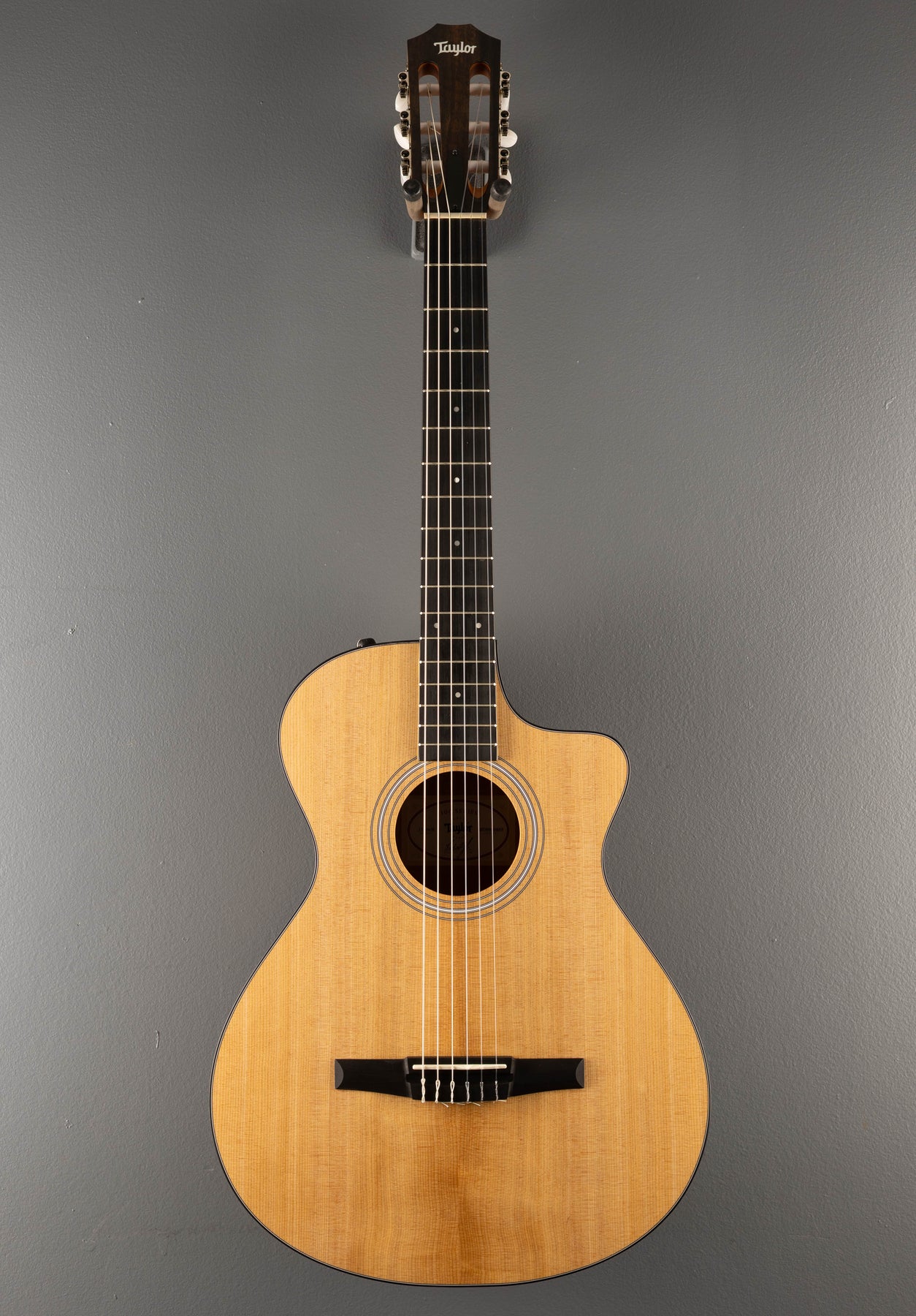 Excellent Condition, Natural, Matte finish, Grand Concert body shape with the venetian cutaway, Torrefied Spruce top, Three Ring Plastic Rosette, Nylon series bracing, Layered Sapele back and sides, Black binding, Ebony fingerboard with the faux pearl 4mm dot inlays on a Mahogany neck, 25.5” scale length, 1 7/8th” nut width, Strip tuners, With the ES-N pickup system and gig bag.