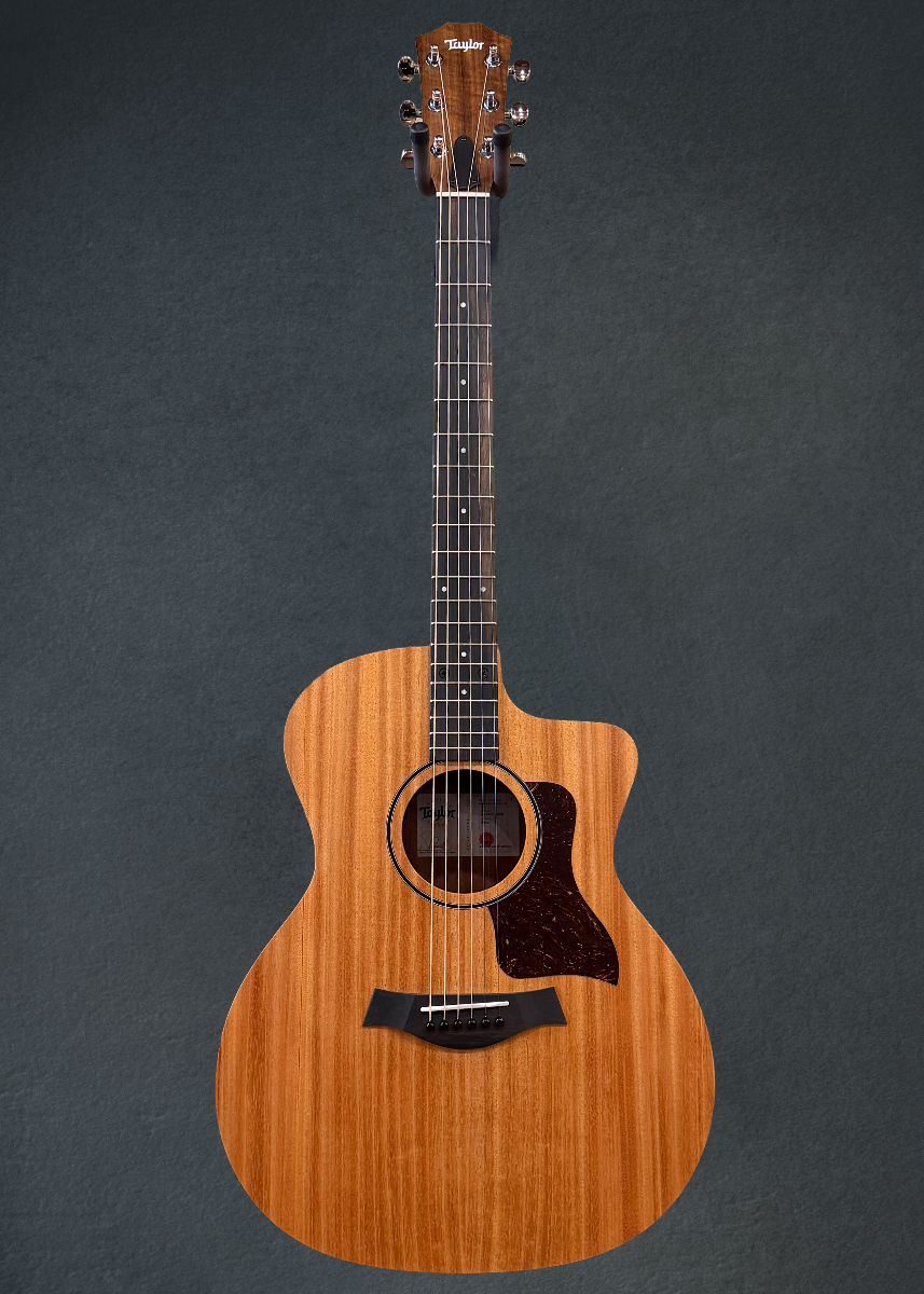 "Blending warm, lively acoustic character with signature Taylor playability, the 24ce brings our full-size, full-scale cutaway Grand Auditorium experience to an accessible entry-level price point. A solid mahogany top delivers a warm, dry tonal profile with a strong focus on the midrange—perfect for players who enjoy a rootsy, earthy sound. Featuring layered sapele back and sides, the 24ce’s tonal balance makes it a dependable choice for strummers and fingerstyle players alike. Inside, Taylor's unique voicing architecture bolsters the overall volume and sustain, with greater harmonic agreement between notes along the entire ebony fretboard. A slim, heelless maple neck delivers the smooth, familiar feel Taylor players expect. Visually, the 24ce keeps things simple yet stylish with subtle 4mm dot inlays, a single-ring black rosette, chrome tuners and a faux-tortoiseshell pickguard. This model includes onboard Fishman Sonitone GT-2 electronics and ships in a gig bag so you can easily plug in and play wherever your music takes you."