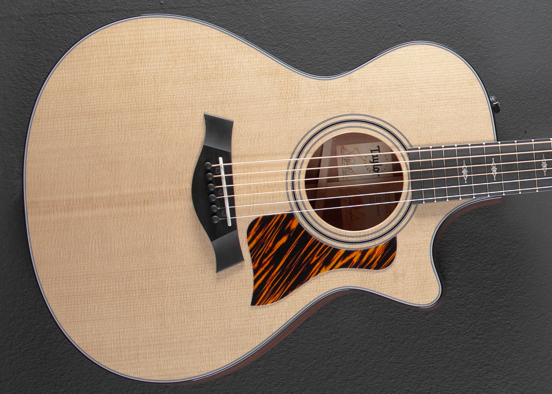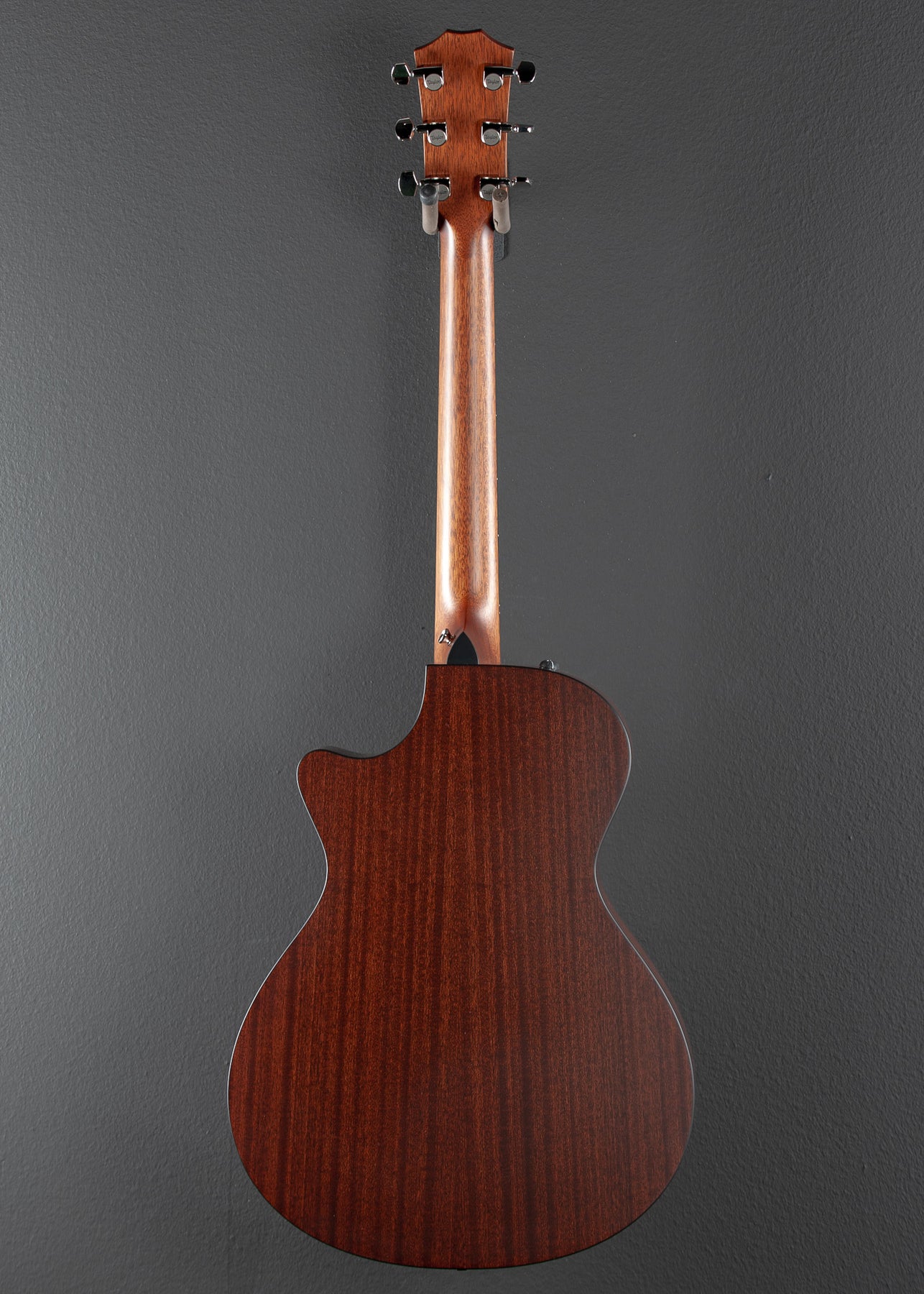 Natural, Gloss top/matte and neck body finish, Grand Concert body shape with Venetian cutaway, Sitka Spruce top, Three Ring Plastic Rosette, V-Class bracing with Relief Rout, Sapele back and sides, Black binding, West African Crelicam Ebony fingerboard with Italian Acrylic Gemstone inlays on a Tropical Mahogany neck, 24 7/8th” scale length, 1 3/4” nut width, Cast/sealed tuners, Expression 2 pickup system, Taylor hardshell case, Excellent