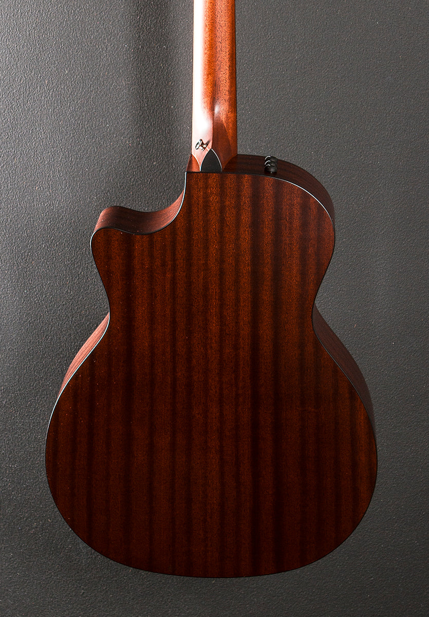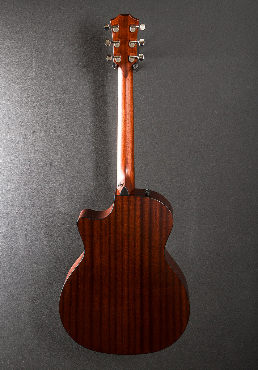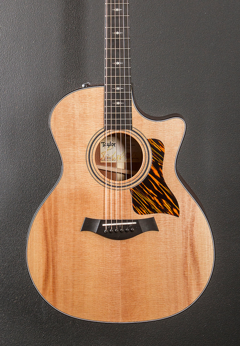 Natural, Gloss top and matte body/neck finish, Grand Auditorium body shape with the venetian cutaway, Sitka Spruce top, Three Ring Plastic Rosette, V-Class bracing with Relief Rout, Sapele back and sides, Black binding, West African Crelicam Ebony fingerboard with the Italian Acrylic Gemstone inlays on a Tropical Mahogany neck, 25.5” scale length, 1 3/4” nut width, Cast/sealed tuners, The neck thickness is .83″ at the first and .87″ at the 9th frets, With the Expression 2 pickup system and Taylor hardshell case, Excellent