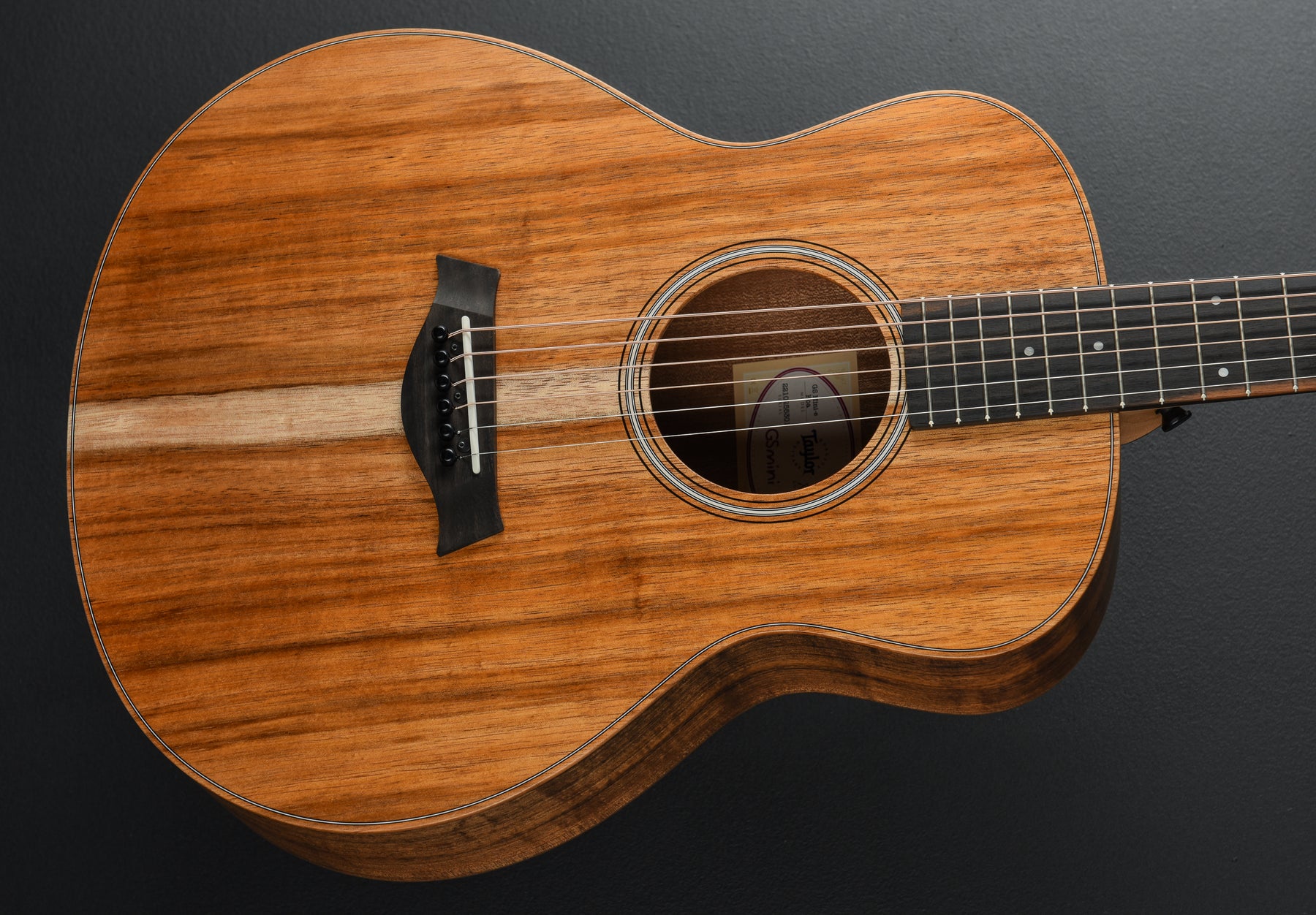 The GS Mini-e Koa brings the vibrant sound and organic beauty of Hawaiian koa to Taylor's ultra-popular reduced-scale acoustic guitar. The GS Mini's compact proportions make it a great choice for players who take their music on the road, and with a solid koa top, this model serves up a rich, bold sound that punches well above its weight for a smaller guitar. The built-in ES-B pickup offers clear, natural amplified tone and includes a digital tuner with an easy-to-read LED display. The GS Mini-e Koa ships with a structured gig bag."