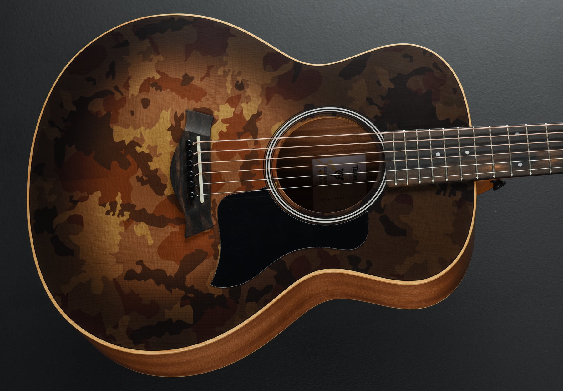 Excellent Condition, Custom Camo Artwork Matte Finish, Miniature Grand Symphony Body Shape, Torrefied Spruce Top with X Bracing, Layered Sapele Back and Sides, Tropical Mahogany Neck with a .83"–.87" Thickness and a 14" Radius Ebony Fingerboard with Faux Pearl 4mm Dot Inlays, 23.5" Scale Length, 1 11/16" Nut Width, Cast/Sealed Tuners, Comes  with a Gig Bag.