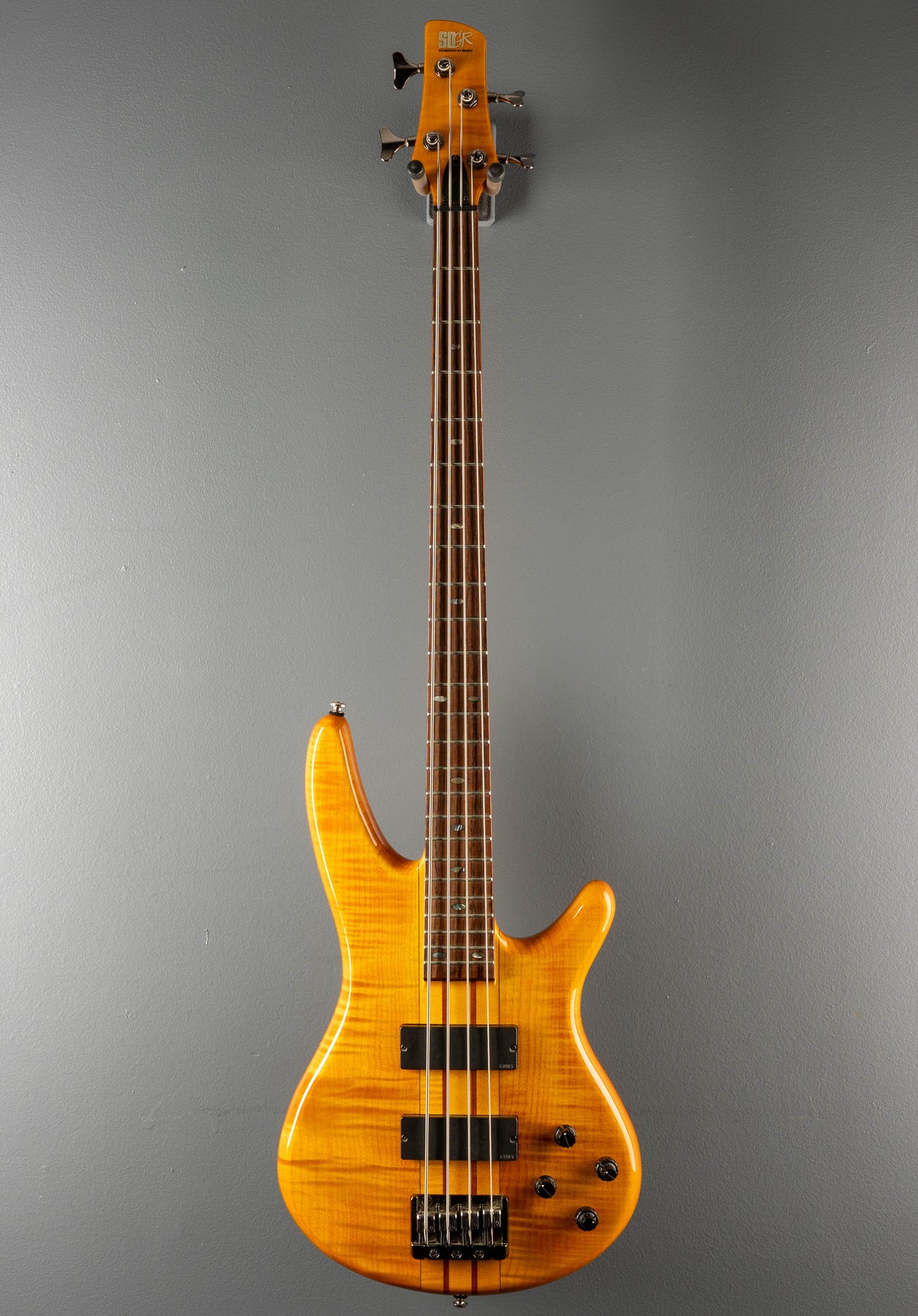 Very Good Condition, Amber, Gloss finish, Flame Maple top, Mahogany body wings, Thru body SRT4 shaped five piece Maple/Bubinga neck with the volute, 12" radius Rosewood fingerboard with the Abalone oval inlays and medium jumbo frets, 34" scale length, 1.51" nut width, neck depth measures .87" at the 1st fret and .93" at the 12th fret, Active EMG 40DC bridge and neck pickups, 9 volt preamp with the master volume/pickup blend/stacked bass and treble/stacked mid boost-cut and mid-frequency controls, Accu-cast B20 bridge and cast/sealed tuners, 8.8 pounds, no case included.