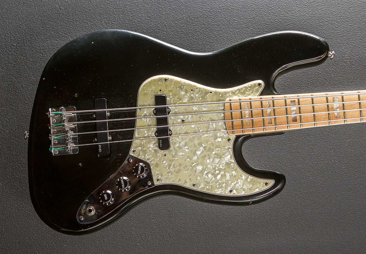 Black, Ash body, 70's U shaped Maple neck, Bound 7.25" radius Maple fingerboard with the pearl block inlays and original low profile frets, 34" scale length, 1.5" nut width, Repro pickguard and knobs, Active EMG Jazz bass bridge and neck pickups have been installed, Newer volume/tone/tone pots, Original bridge and tuners, The neck thickness is .84″ at the first and .99″ at the 12th frets, 12.0 pounds, With the Fender black tolex hardshell case, Very good