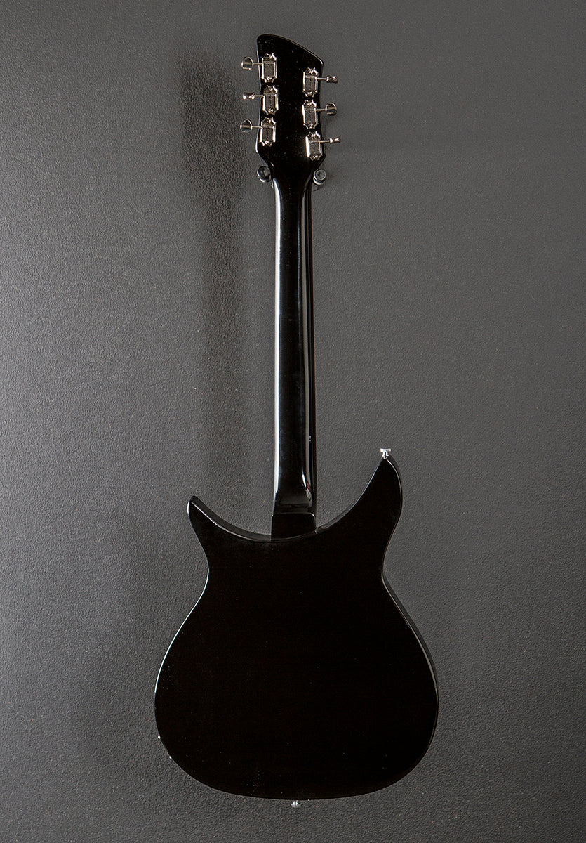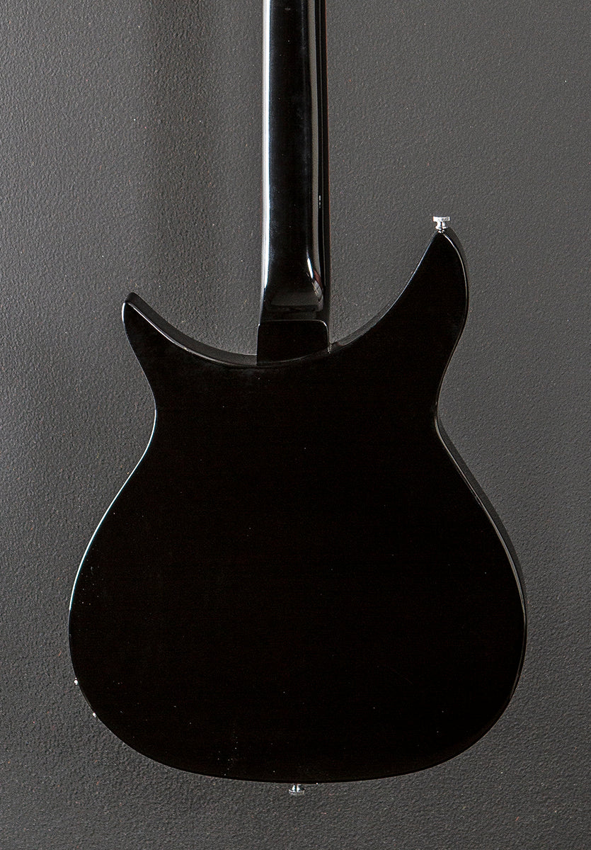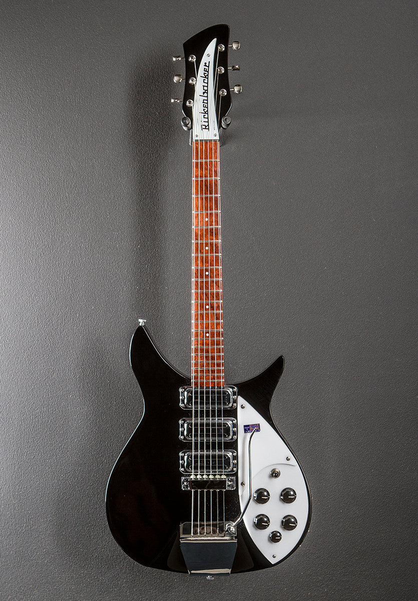 Jetglo, 13" wide semi-hollow Maple body, Set-in Maple neck, 7.25" radius Rosewood fingerboard and the dot inlays and vintage size frets, 21″ scale length, 1 5/8th″ nut width, Rickenbacker vintage single coil Toaster Top pickups, 3-way toggle switching with the two volume and two tone controls plus the bass blend control, Standard mono output jack, Six roller saddle bridge and Accent vibrato, Ric deluxe tuners, The neck thickness is .90″ at the first and .99″ at the 12th frets, 6.4 pounds, With the Rickenbacker hardshell case, Very good