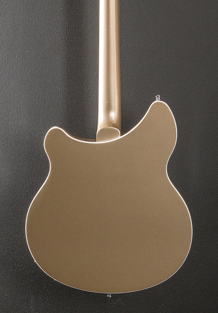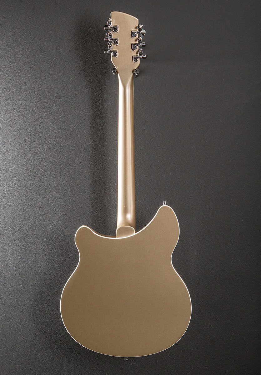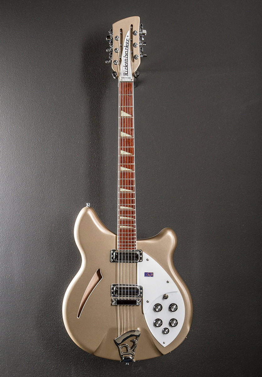 Desert Gold, This was a "color of the year in 2001", 15″ wide semi-hollow Maple body, Set-in Maple/Walnut neck, Bound 10" radius Rosewood fingerboard with the triangle inlays and vintage size frets, 24.75″ scale length, 1 5/8th″ nut width, Rickenbacker vintage single coil Toaster Top bridge and neck pickups, 3-way toggle switching with the volume and tone controls for each pickup plus the bass blend control, Rick-o-Sound and standard mono output jacks, Six saddle adjustable bridge and "R" tailpiece, Schaller tuners, The neck thickness is .95″ at the first and .98″ at the 12th frets, 7.8 pounds, With the Rickenbacker hardshell case, Very good