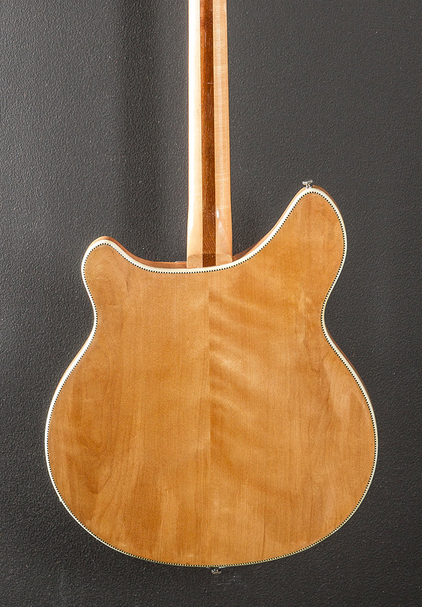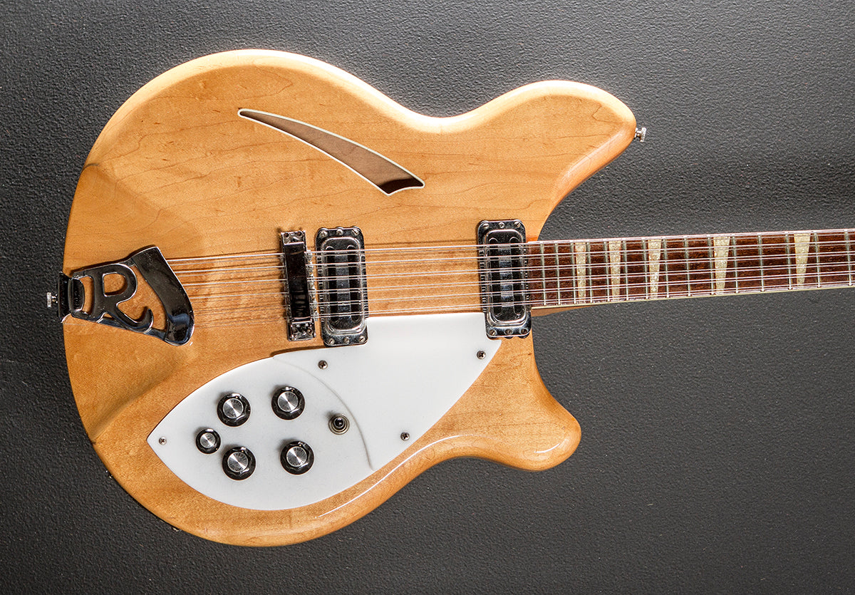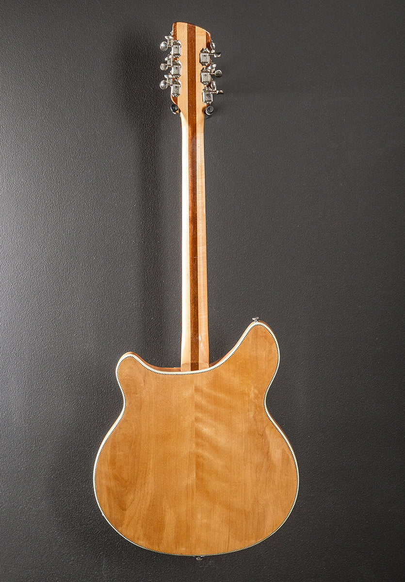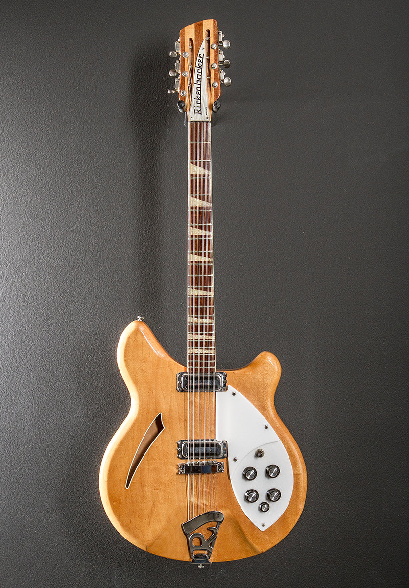 Mapleglo, 15″ wide semi-hollow Maple body, Set-in Maple/Walnut neck, Bound 7.25" radius Rosewood fingerboard with the crushed pearl triangle inlays and original small frets, 24.75″ scale length, 1 9/16th″ nut width, Original Rickenbacker single coil Toaster Top bridge and neck pickups,  3-way toggle switching with the volume and tone controls for each pickup plus the bass blend control, Rick-o-Sound and standard mono output jacks, Six saddle adjustable bridge and "R" tailpiece, Kluson deluxe tuners, The neck thickness is .82″ at the first and .87″ at the 12th frets, 7.6 pounds, With the Rickenbacker hardshell case, Very good