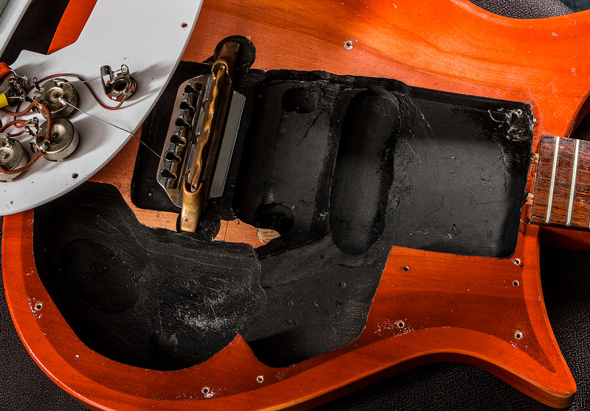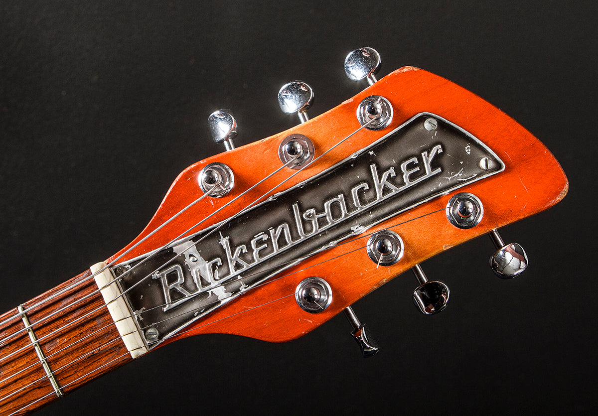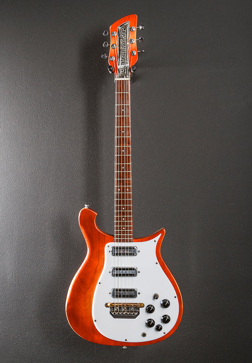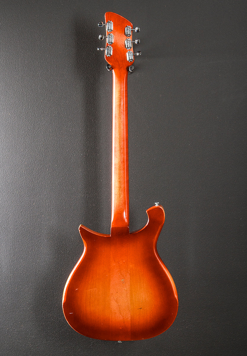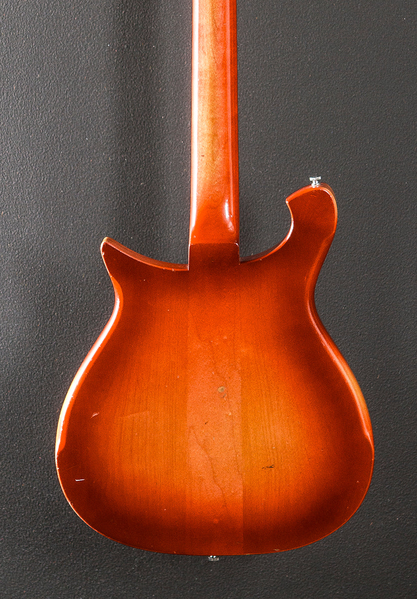 Fireglo, Maple body wings, Thru body Maple neck, 7.25" radius Rosewood fingerboard with the dot inlays and original small size frets, 24.75″ scale length, 1 5/8th″ nut width, Repro pickguard, Original Rickenbacker single coil Toaster Top bridge and neck pickups, The body was routed for the added older Toaster Top middle pickup, 3-way toggle switching with the volume and tone controls for the bridge and neck pickups plus the added volume control for the middle pickup, Original compensated bridge, Newer Schaller deluxe tuners were installed, The neck thickness is .80″ at the first and .84″ at the 12th frets, 6.8 pounds, With the Rickenbacker hardshell case, Very good