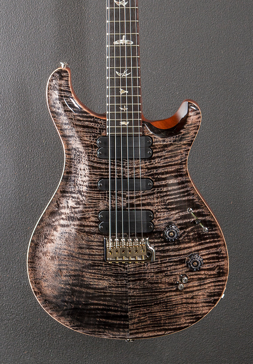 Charcoal, Gloss finish, Violin carved figured Maple top, Mahogany body, Pattern Regular carved Mahogany neck, 10" radius Rosewood fingerboard with the Bird inlays, 25.25″ scale length, 1 11/16th" nut, PRS 509 humbucking bridge and neck pickups plus the 509 single coil middle pickup, 5-way blade switching with the master volume and tone controls plus the two mini-toggle coil tap switches, PRS Gen III tremolo and PRS Phase III locking tuners, 8.0 pounds, With hardshell case, Excellent