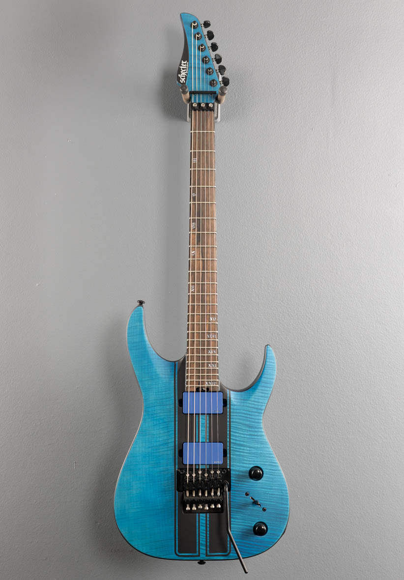 Very Good Condition, Stamped “2” on back of headstock, Satin Trans Blue, Flame Maple top on a Mahogany body, 14” radius Ebony fingerboard with the Offset/Reverse Roman Numeral inlays and jumbo frets, Ultra thin U shaped set-in w/ultra access three piece Maple neck that has the carbon fiber reinforcement rods, 25.5″ scale length, 1.625” nut width, EMG 81 bridge and EMG 60 neck pickups, Volume/Tone and 3-way switching, Floyd Rose Special ‘Hot Rod’ locking tremolo, Schecter tuners, 8.1 pounds, Case not included.