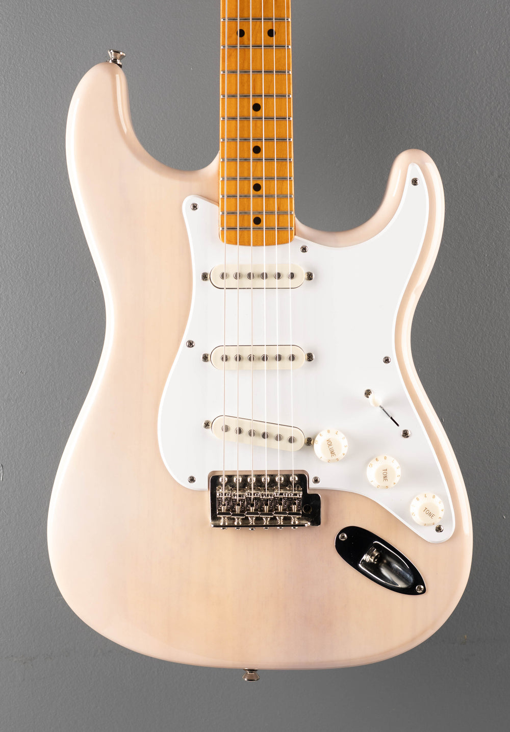 Very Good Condition, White Blonde, Pine body, Gloss Polyurethane body finish, C shaped Maple neck with a 9.5” radius fingerboard and narrow tall frets, 25.5″ scale length, 1.65” nut width, Fender Designed Alnico Single-Coil pickups, 5-way switching, 6-Saddle Vintage-Style Synchronized Tremolo bridge, Vintage style tuners, 7.2 pounds, comes with gig bag.