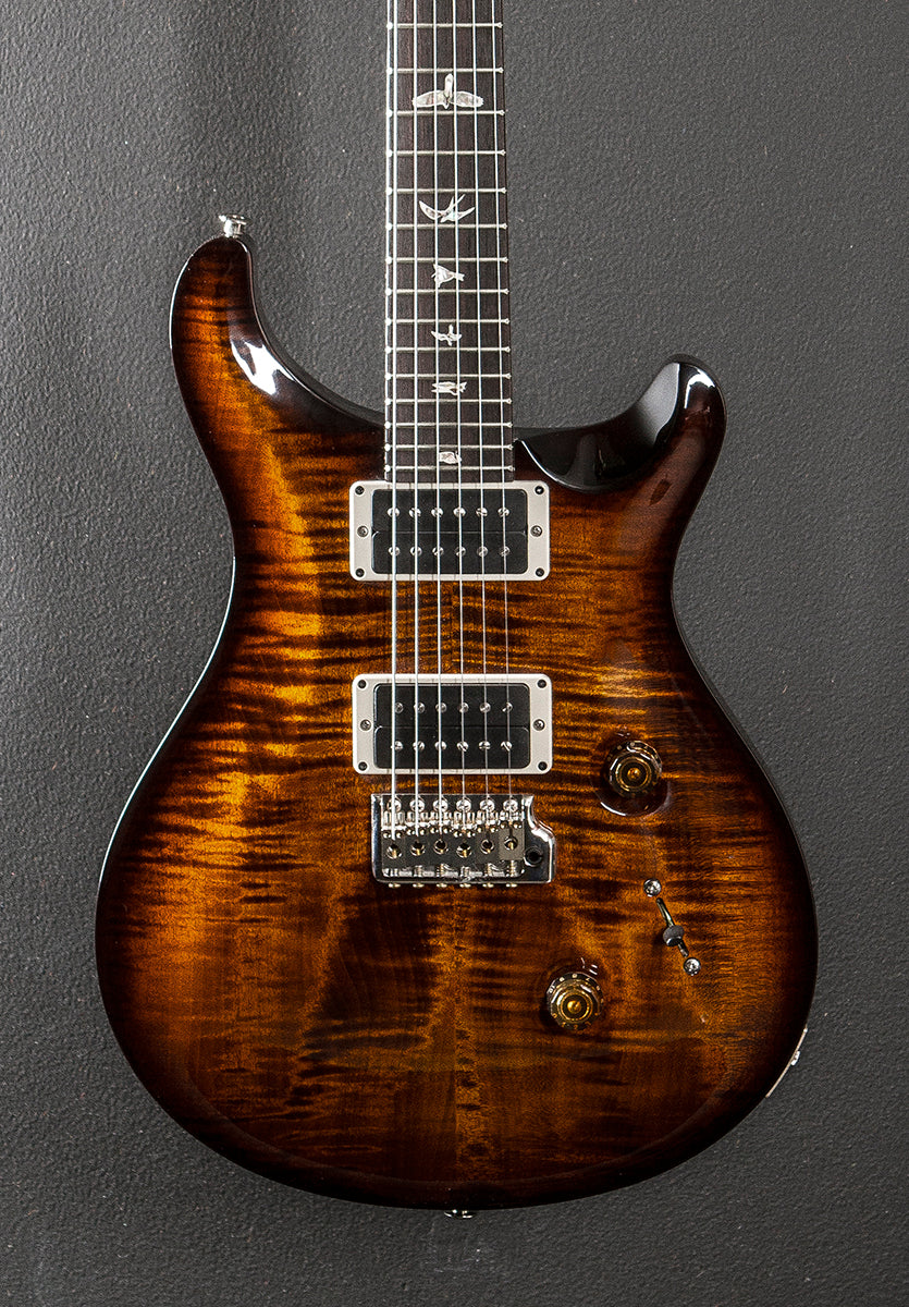 Black Gold Burst Wraparound, High gloss nitro finish, Violin carved figured Maple top, Mahogany body, Pattern Thin carved Mahogany neck, 10" radius Rosewood fingerboard with the Bird inlays, 25″ scale length, 1 11/16th" nut, PRS 85/15 bridge and neck pickups, 5-way blade switching with the volume and tone controls, PRS Gen III tremolo, PRS Phase III locking tuners with the wing buttons, The neck thickness is .83″ at the first and .91″ at the 12th frets, 7.4 pounds, With the PRS hradhell case, Very good