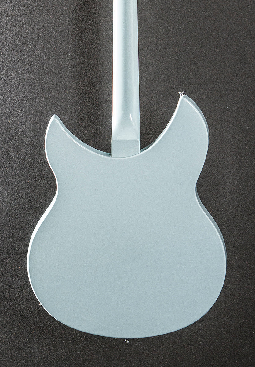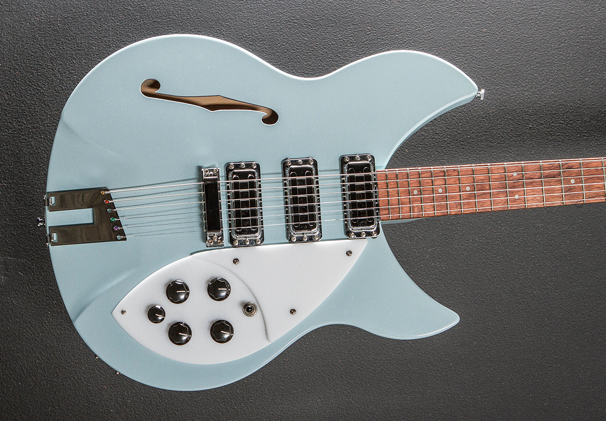 Refinished in Blue Boy by Paul Wileynski, 15" wide semi-hollow Maple body, Set-in Maple/Walnut neck, 12" radius unfinished Rosewood fingerboard with the dot inlays and vintage size frets, 24.75″ scale length, 1 11/16th" nut width, Rickenbacker vintage single coil Toaster Top pickups, 3-way toggle switching with the two volume and two tone controls plus the bass blend control, Mono output jack, Six saddle adjustable bridge and trapeze tailpiece, Vintage style tuners, The neck thickness is .87″ at the first and .90″ at the 12th frets, 8.2 pounds, With the Rickenbacker silver tolex hardshell case, Very good