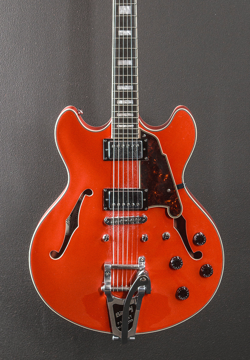 Fiesta Red, Gloss finish, Semi-hollow Mahogany body with a solid center block, C shaped Maple neck with a bound 14" radius Rosewood fingerboard and medium frets, 24.75" scale length, 1 11/16th" nut width, D'Angelico humbucking bridge and neck pickups, 3-way toggle switching with the volume and tone controls for each pickup, Tune-o-matic bridge and added Bigsby vibrato, Cast/sealed tuners, The neck thickness is .79″ at the first and .89″ at the 12th frets, 8.8 pounds, With gig bag, Very good