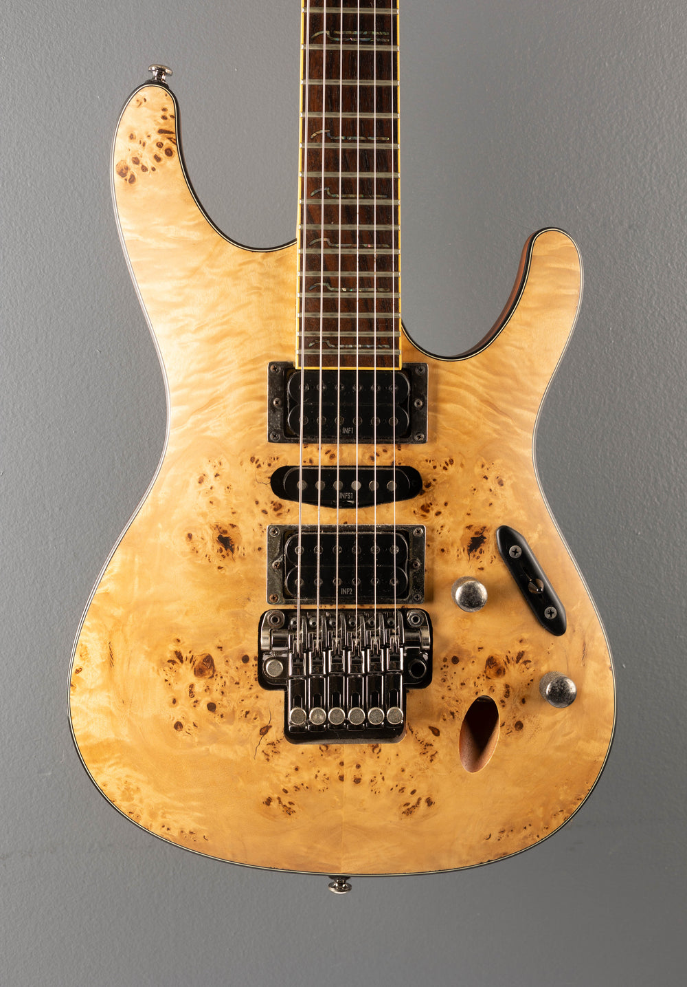 Very Good Condition, Natural Flat, Poplar Burl top on a Mahogany Body, Bound 15.75" radius Rosewood fingerboard with S Wave inlays and Jumbo frets on a Wizard III shaped 3 piece Maple Neck, 25.5" scale length, 1 11/16" nut width, Factory Ibanez INF pickups, 5 way switching with volume and tone controls, ZR tremolo bridge w/ ZPS2, closed gear tuners, 7.1 pounds, with hardshell case.