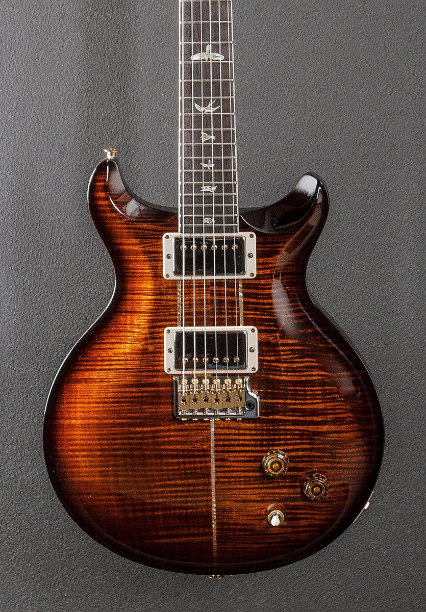 Black Gold Burst, Gloss finish, Violin carved Flame Maple 10 top, Mahogany body, Santana Retro carved Mahogany neck, Bound 10″ radius Rosewood fingerboard with the Bird inlays, 24.5″ scale length, 1 11/16th” nut width, PRS Santana bridge and neck pickups, 3-way toggle switching with the volume and tone controls, PRS patented Gen III tremolo and PRS Phase III locking tuners, 8.6 pounds, With the PRS hardshell case, Excellent