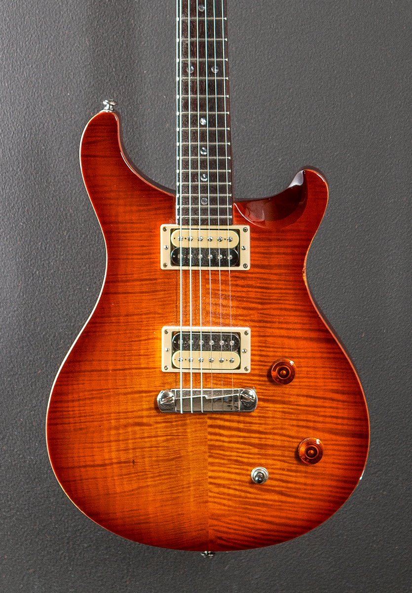 Cherry Sunburst, Maple top with a Flame Maple veneer, Mahogany body, Wide/Thin Maple neck, 10" radius Rosewood fingerboard with the Moon inlays, 25" scale length, 1 11/16th" nut width, PRS SE humbucking bridge and neck pickups, 3-way toggle switching with the volume and tone controls, PRS stop tailpiece and PRS designed tuners, With gig bag, Very good