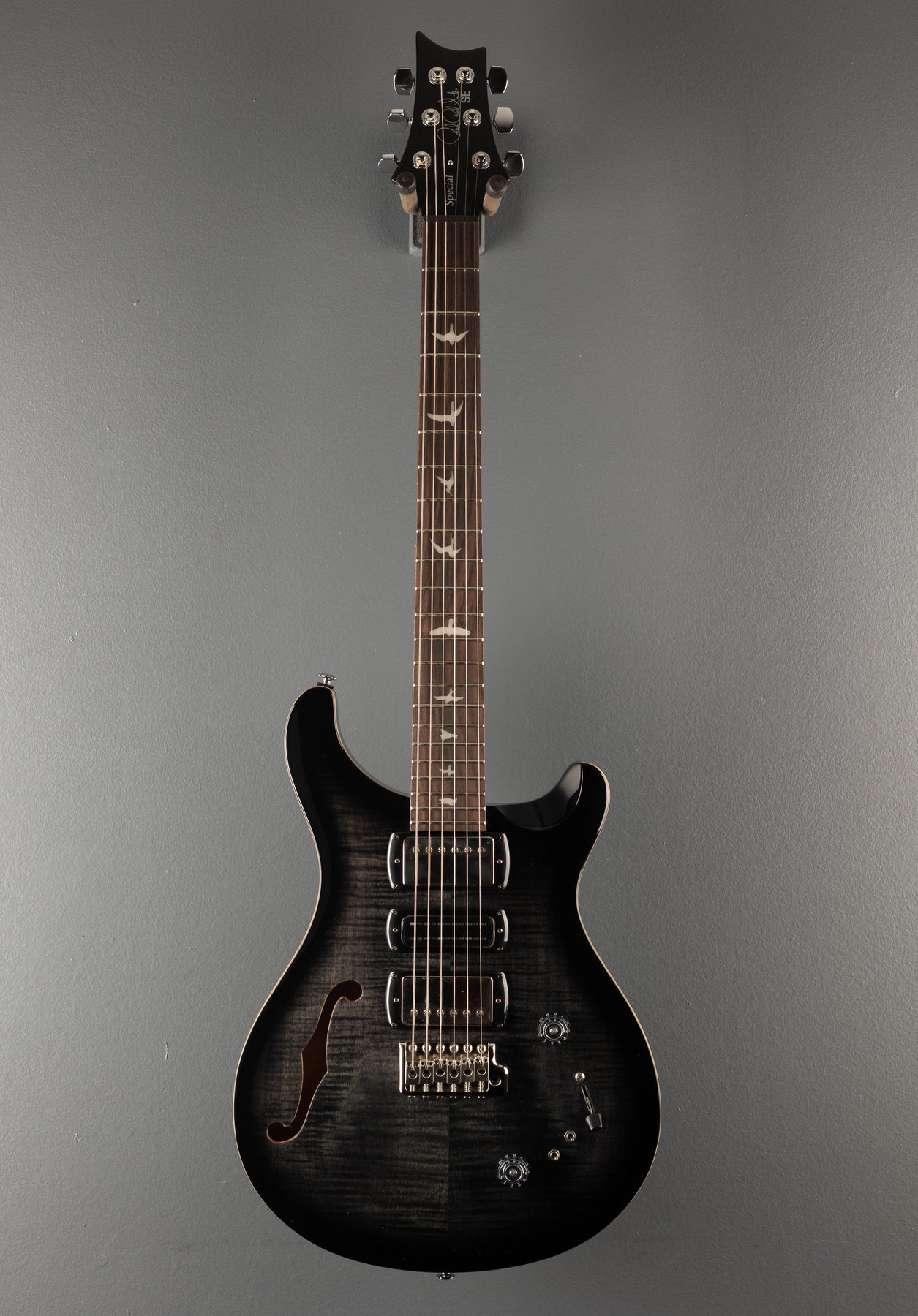 Excellent Condition, Charcoal Burst, Semi Hollow Mahogany body with Single F Hole, Shallow Violin Carved Maple cap with a Figured Maple veneer, 10" radius Rosewood fingerboard with bird inlays on a Wide Thin carved Maple neck, 1 11/16" nut width, 25" scale length, 58/15 “S” neck and bridge pickups with the Narrowfield DD “S” Middle pickup, Volume and Tone Controls with 5-Way Blade Pickup Switch and Two Mini-Toggle Coil Tap Switches, PRS Patented Tremolo and PRS Designed Tuners, 7.5 pounds, comes with gig bag.