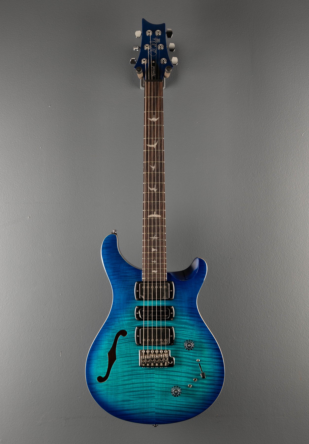 Excellent Condition, Lake Blue, Semi Hollow Mahogany body with Single F Hole, Shallow Violin Carved Maple cap with a Figured Maple veneer, 10" radius Rosewood fingerboard with bird inlays on a Wide Thin carved Maple neck, 1 11/16" nut width, 25" scale length, 58/15 “S” neck and bridge pickups with the Narrowfield DD “S” Middle pickup, Volume and Tone Controls with 5-Way Blade Pickup Switch and Two Mini-Toggle Coil Tap Switches, PRS Patented Tremolo and PRS Designed Tuners, 7.5 pounds, comes with gig bag.