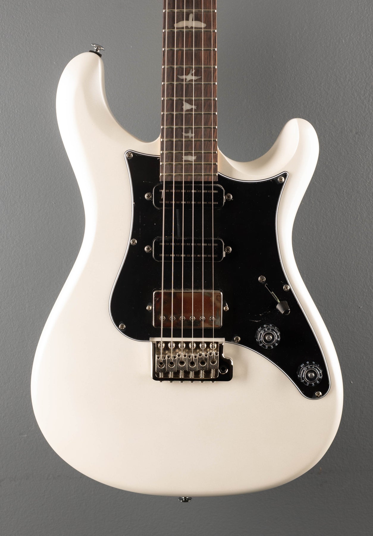 Very Good Condition, White Pearl, Flat Top Mahogany body, 10" radius Rosewood fingerboard with bird inlays on a Wide Thin carved Maple neck, 1 11/16" nut width, 25" scale length, 58/15 “S” bridge and Narrowfield DD “S” Neck/Middle pickups, 5 way switching with volume and push pull coil tap tone controls, PRS Patented Tremolo and PRS Designed Tuners, 7.6 pounds, comes with gig bag.